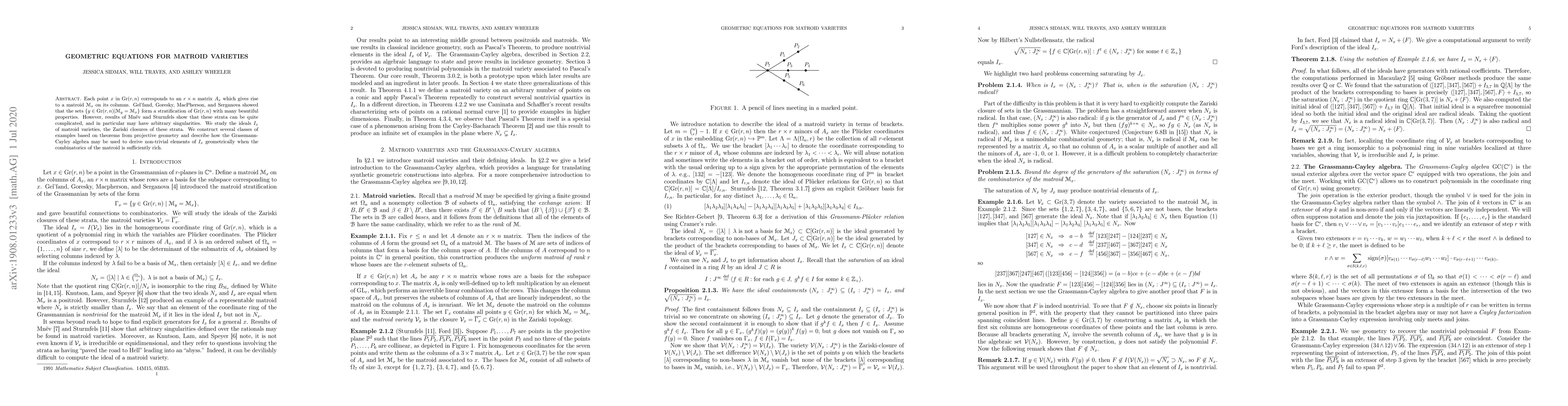 Each point $x$ in Gr$(r,n)$ corresponds to an $r \times n$ matrix $A_x$ which gives rise to a matroid $M_x$ on its columns. Gel'fand, Goresky, MacPherson, and Serganova showed that the sets $\{y \in \mathrm{Gr}(r,n) | M_y = M_x\}$ form a stratification of Gr$(r,n)$ with many beautiful properties. However, results of Mn\"ev and Sturmfels show that these strata can be quite complicated, and in particular may have arbitrary singularities. We study the ideals $I_x$ of matroid varieties, the Zariski closures of these strata. We construct several classes of examples based on theorems from projective geometry and describe how the Grassmann-Cayley algebra may be used to derive non-trivial elements of $I_x$ geometrically when the combinatorics of the matroid is sufficiently rich.