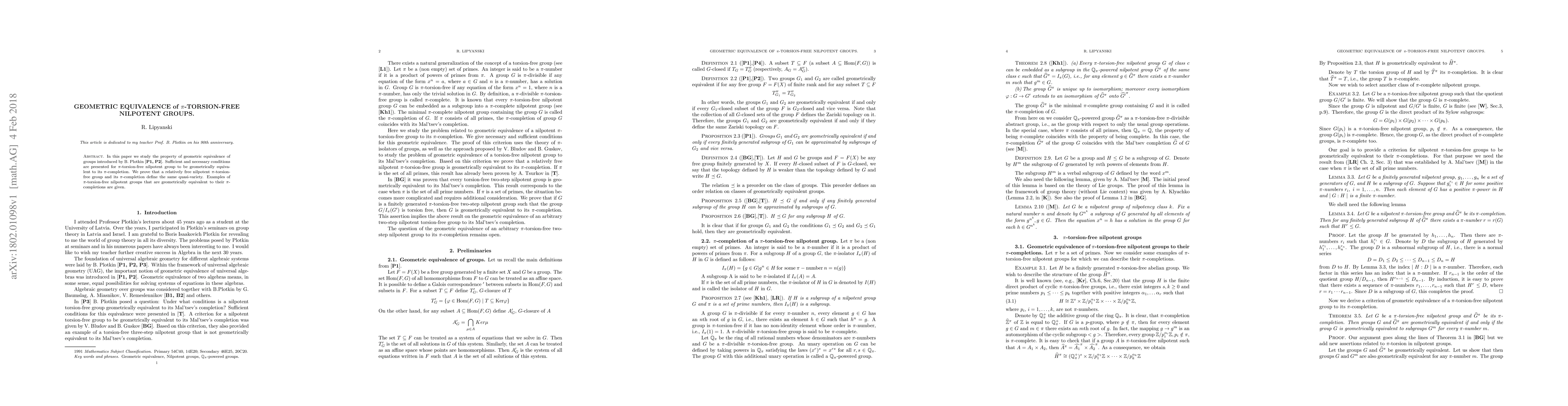 This paper investigates geometric equivalence in $\pi$-torsion-free nilpotent groups, presenting conditions for such equivalence and proving that these groups and their $\pi$-completions define the same quasi-variety. Examples of equivalent groups are also provided.