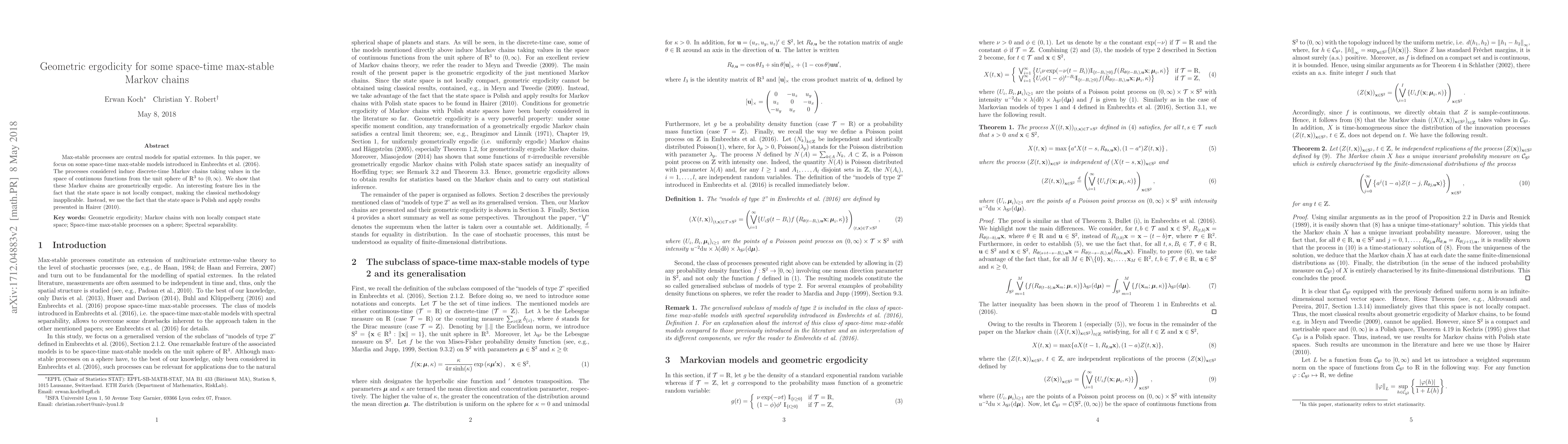This paper investigates geometric ergodicity for space-time max-stable Markov chains, which model spatial extremes. It demonstrates that these chains are geometrically ergodic despite the non-locally compact state space, leveraging the Polish nature of the space and results from Hairer (2010).