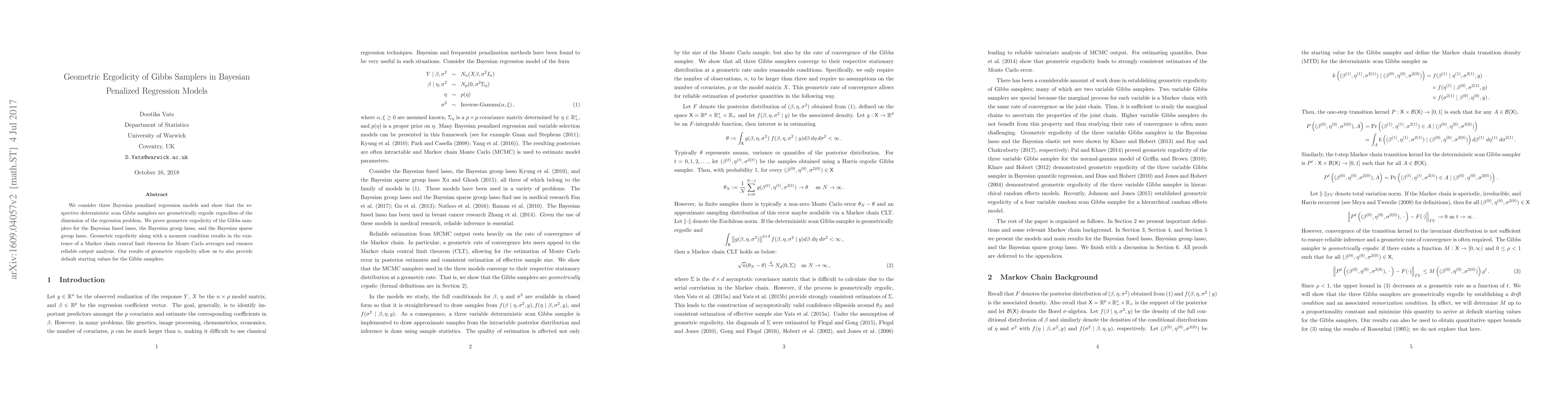 This paper demonstrates the geometric ergodicity of Gibbs samplers for three Bayesian penalized regression models: the Bayesian fused lasso, the Bayesian group lasso, and the Bayesian sparse group lasso. The findings ensure reliable output analysis and provide default starting values for the samplers.