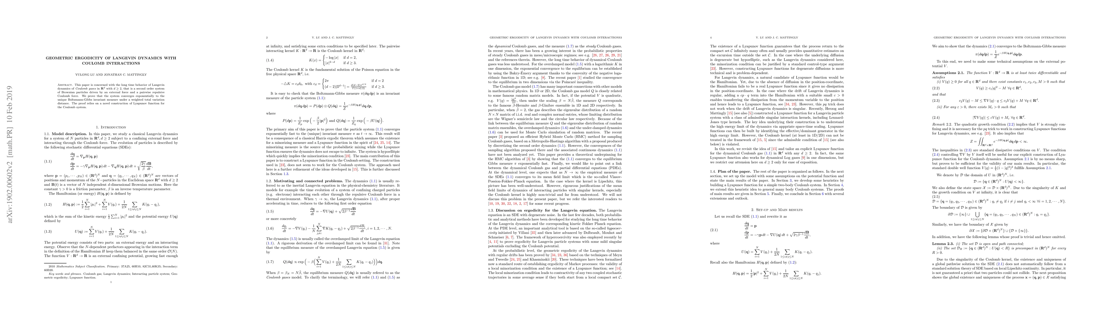 This paper is concerned with the long time behavior of Langevin dynamics of {\em Coulomb gases} in $\mathbf{R}^d$ with $d\geq 2$, that is a second order system of Brownian particles driven by an external force and a pairwise repulsive Coulomb force. We prove that the system converges exponentially to the unique Boltzmann-Gibbs invariant measure under a weighted total variation distance. The proof relies on a novel construction of Lyapunov function for the Coulomb system.