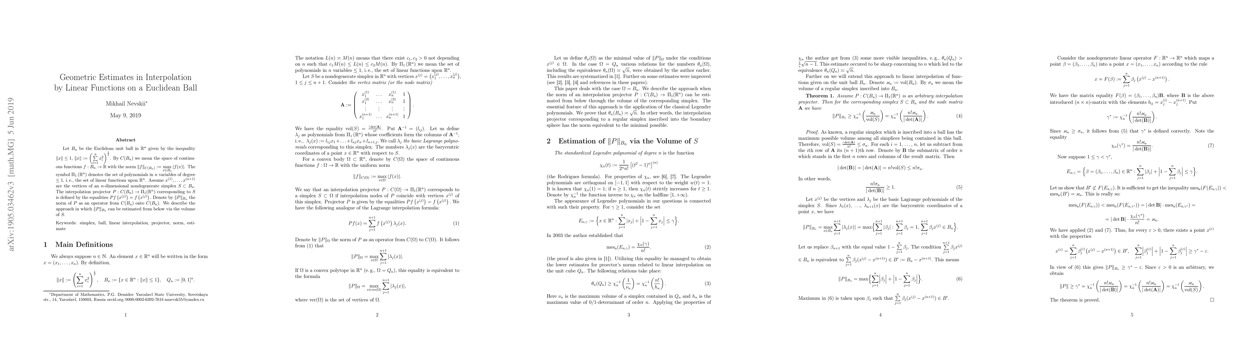 This paper investigates the interpolation projector $P$ mapping continuous functions on the Euclidean unit ball $B_n$ to linear functions, focusing on the norm $\|P\|_{B_n}$. It provides geometric estimates for $\|P\|_{B_n}$ based on the volume of the simplex $S$ formed by the vertices used in the interpolation.