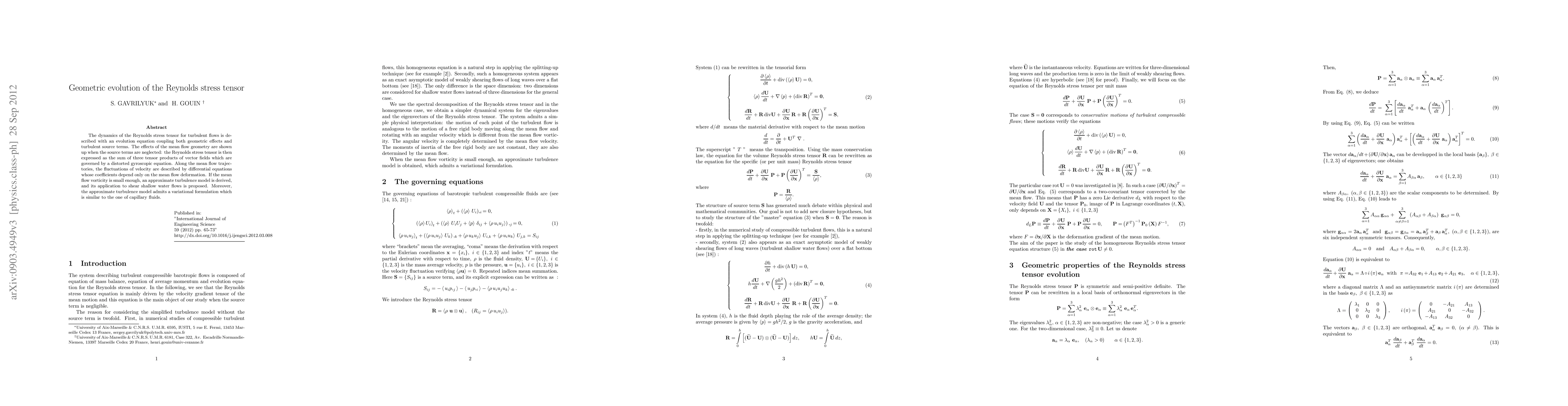 The dynamics of the Reynolds stress tensor for turbulent flows is described with an evolution equation coupling both geometric effects and turbulent source terms. The effects of the mean flow geometry are shown up when the source terms are neglected: the Reynolds stress tensor is then expressed as the sum of three tensor products of vector fields which are governed by a distorted gyroscopic equation. Along the mean flow trajectories, the fluctuations of velocity are described by differential equations whose coefficients depend only on the mean flow deformation. If the mean flow vorticity is small enough, an approximate turbulence model is derived, and its application to shear shallow water flows is proposed. Moreover, the approximate turbulence model admits a variational formulation which is similar to the one of capillary fluids.