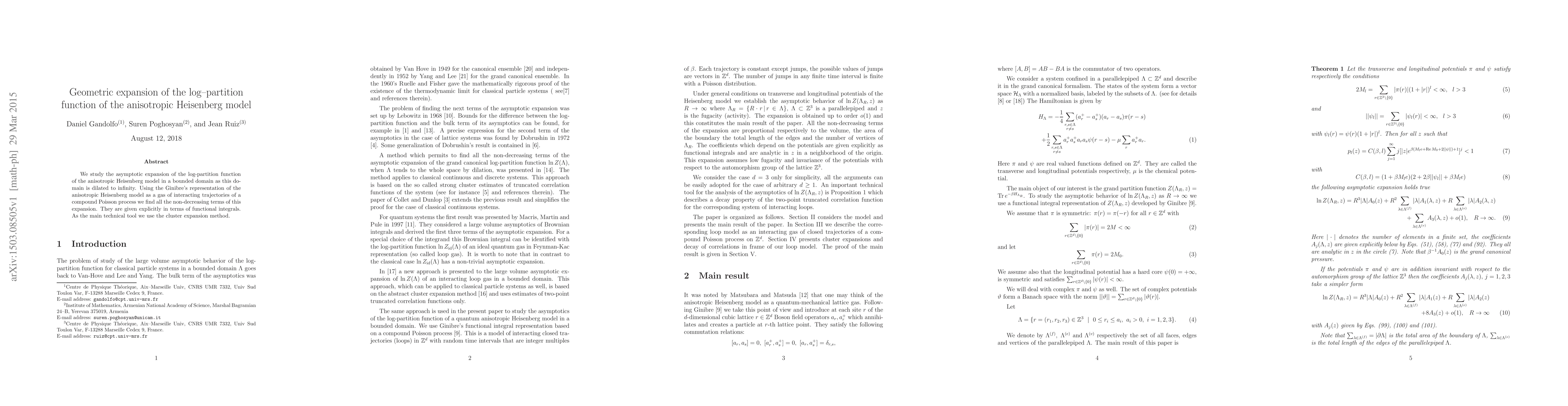 This paper investigates the asymptotic expansion of the log-partition function for the anisotropic Heisenberg model in the limit of infinite domain size. It utilizes the cluster expansion method to explicitly determine all non-decreasing terms in the expansion, represented through functional integrals.