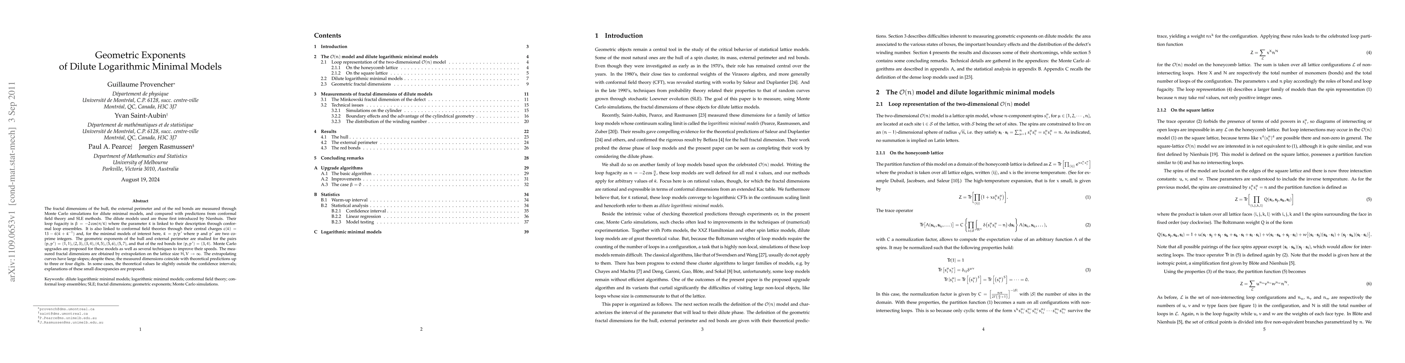 The fractal dimensions of the hull, the external perimeter and of the red bonds are measured through Monte Carlo simulations for dilute minimal models, and compared with predictions from conformal field theory and SLE methods. The dilute models used are those first introduced by Nienhuis. Their loop fugacity is beta = -2cos(pi/barkappa}) where the parameter barkappa is linked to their description through conformal loop ensembles. It is also linked to conformal field theories through their central charges c = 13 - 6(barkappa + barkappa^{-1}) and, for the minimal models of interest here, barkappa = p/p' where p and p' are two coprime integers. The geometric exponents of the hull and external perimeter are studied for the pairs (p,p') = (1,1), (2,3), (3,4), (4,5), (5,6), (5,7), and that of the red bonds for (p,p') = (3,4). Monte Carlo upgrades are proposed for these models as well as several techniques to improve their speeds. The measured fractal dimensions are obtained by extrapolation on the lattice size H,V -> infinity. The extrapolating curves have large slopes; despite these, the measured dimensions coincide with theoretical predictions up to three or four digits. In some cases, the theoretical values lie slightly outside the confidence intervals; explanations of these small discrepancies are proposed.