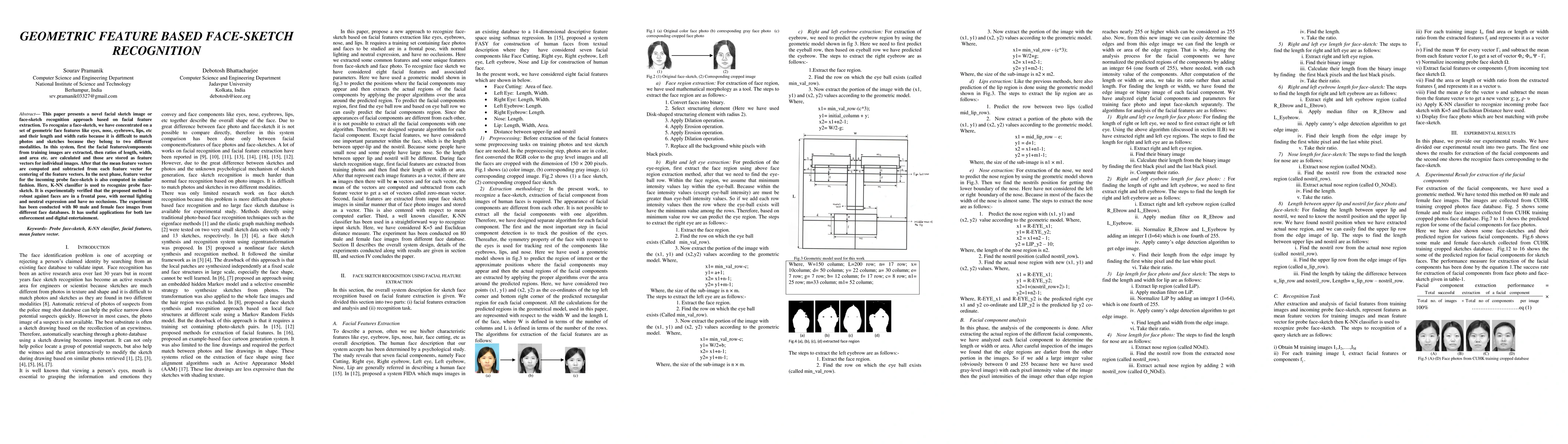 This paper introduces a face-sketch recognition method based on geometric facial feature extraction, using ratios of feature dimensions as vectors. The K-NN classifier effectively recognizes sketches, demonstrating robustness against frontal poses, normal lighting, and neutral expressions.