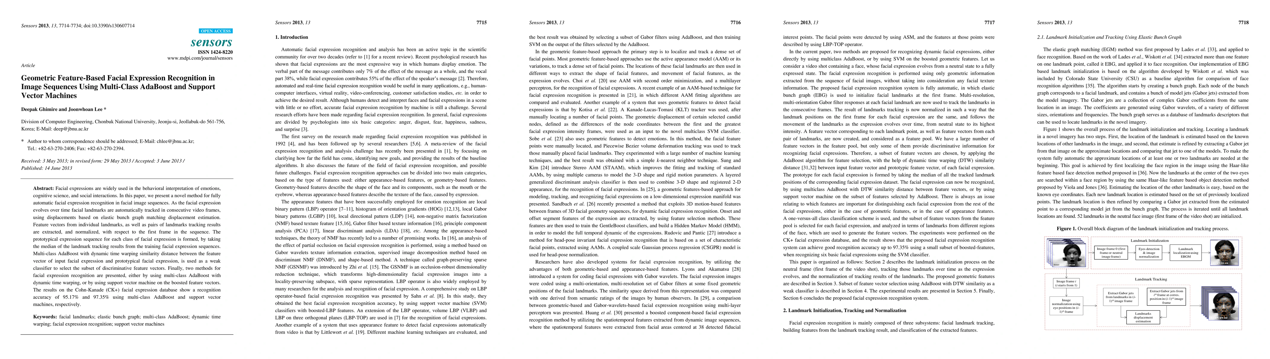 This paper proposes a method for automatic facial expression recognition using tracked facial landmarks and multi-class AdaBoost with dynamic time warping, achieving 95.17% accuracy, or support vector machines for 97.35% accuracy on the Cohn-Kanade (CK+) database.