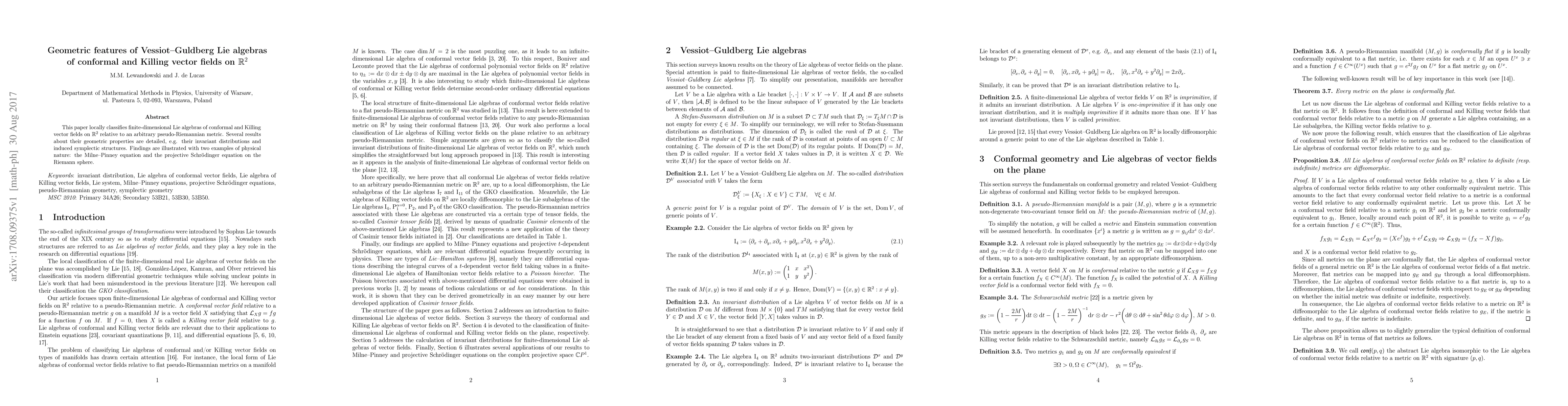 This paper locally classifies finite-dimensional Lie algebras of conformal and Killing vector fields on $\mathbb{R}^2$ relative to an arbitrary pseudo-Riemannian metric. Several results about their geometric properties are detailed, e.g. their invariant distributions and induced symplectic structures. Findings are illustrated with two examples of physical nature: the Milne--Pinney equation and the projective Schr\"odinger equation on the Riemann sphere.