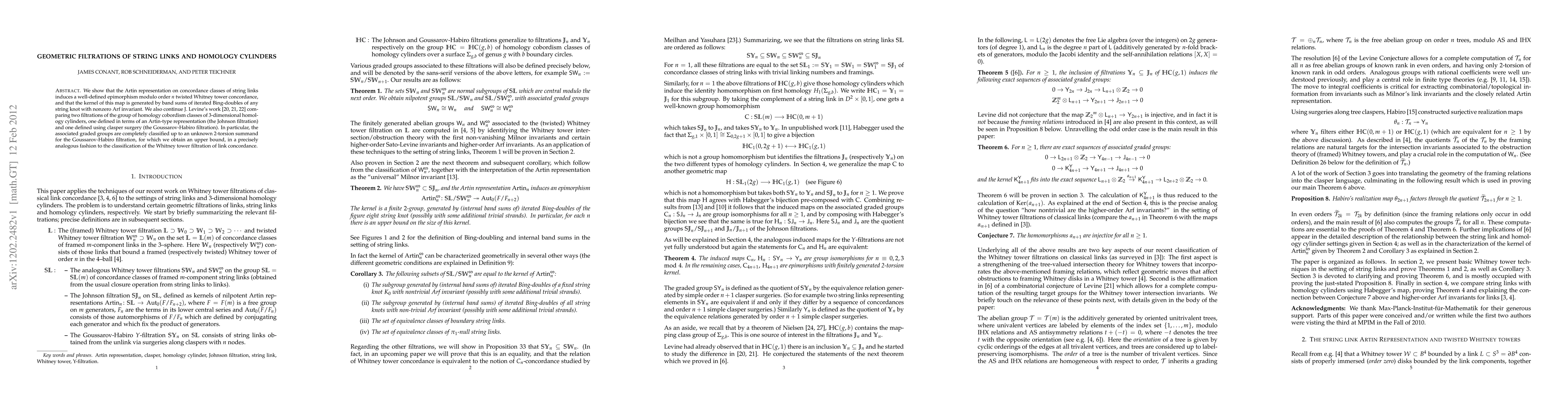This paper demonstrates an epimorphism induced by the Artin representation on string links, linking it to the n-twisted Whitney tower concordance, and identifies its kernel involving Bing-doubles. It also extends Levine's work by comparing two filtrations of homology cylinders, classifying their associated graded groups, except for an unknown 2-torsion summand in the Goussarov-Habiro filtration.