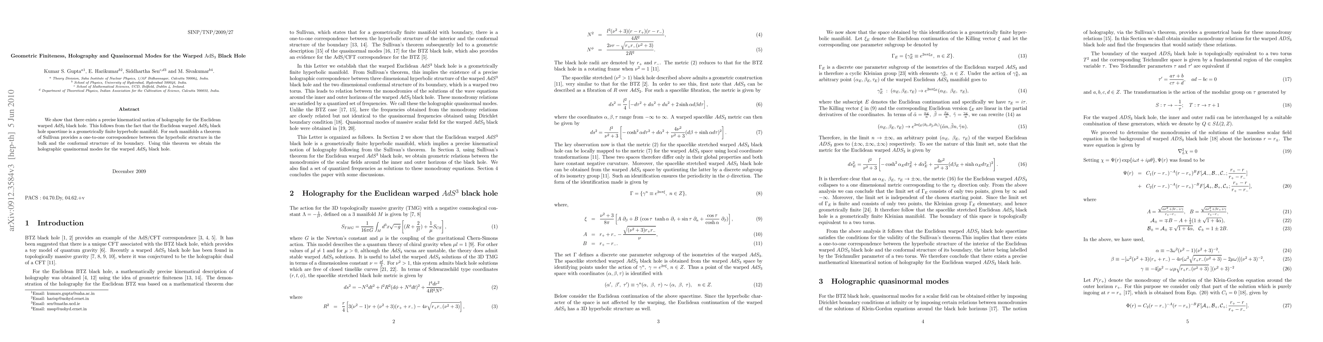 This paper demonstrates a holography correspondence for Euclidean warped $AdS_3$ black holes, showing they are geometrically finite hyperbolic manifolds. Utilizing Sullivan's theorem, it establishes a one-to-one relationship between bulk hyperbolic and boundary conformal structures, leading to holographic quasinormal modes.