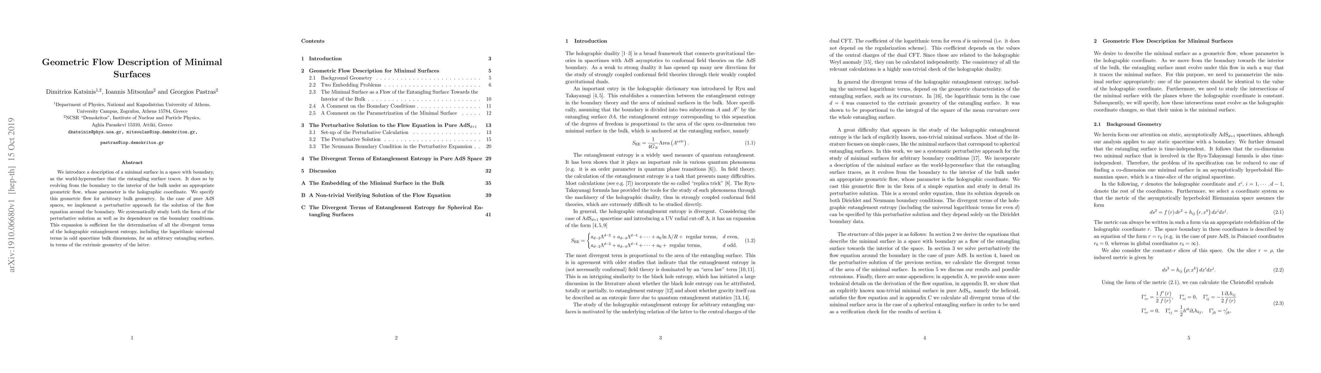 We introduce a description of a minimal surface in a space with boundary, as the world-hypersurface that the entangling surface traces. It does so by evolving from the boundary to the interior of the bulk under an appropriate geometric flow, whose parameter is the holographic coordinate. We specify this geometric flow for arbitrary bulk geometry. In the case of pure AdS spaces, we implement a perturbative approach for the solution of the flow equation around the boundary. We systematically study both the form of the perturbative solution as well as its dependence on the boundary conditions. This expansion is sufficient for the determination of all the divergent terms of the holographic entanglement entropy, including the logarithmic universal terms in odd spacetime bulk dimensions, for an arbitrary entangling surface, in terms of the extrinsic geometry of the latter.