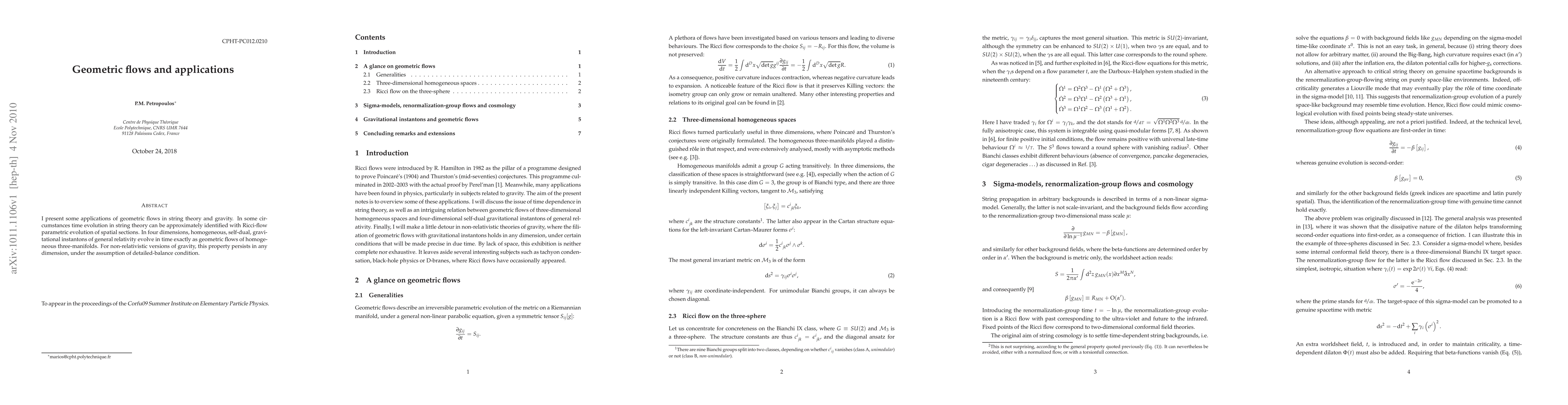 I present some applications of geometric flows in string theory and gravity. In some circumstances time evolution in string theory can be approximately identified with Ricci-flow parametric evolution of spatial sections. In four dimensions, homogeneous, self-dual, gravitational instantons of general relativity evolve in time exactly as geometric flows of homogeneous three-manifolds. For non-relativistic versions of gravity, this property persists in any dimension, under the assumption of detailed-balance condition.