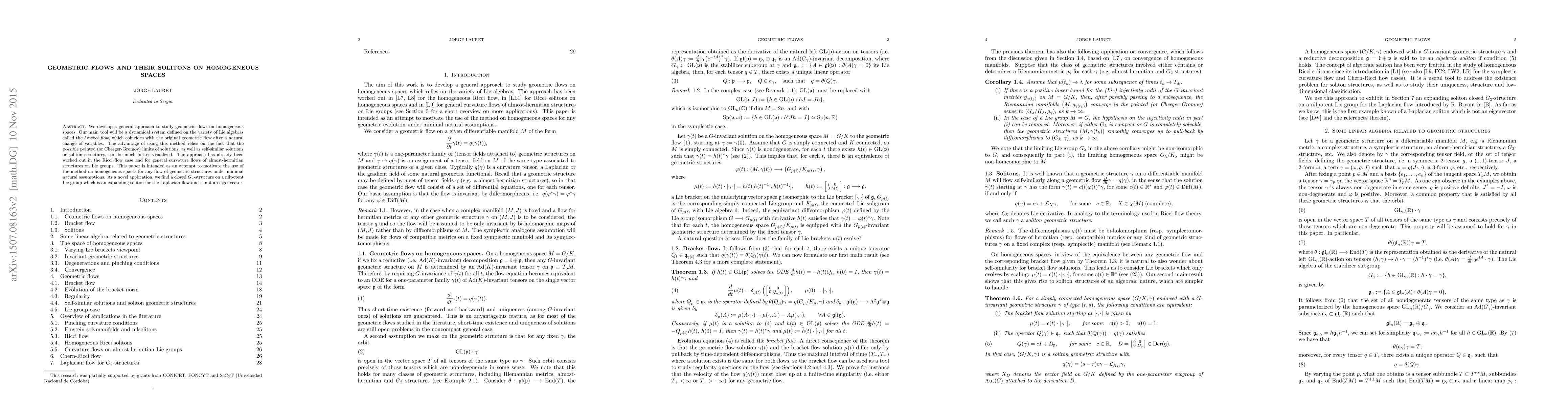 We develop a general approach to study geometric flows on homogeneous spaces. Our main tool will be a dynamical system defined on the variety of Lie algebras called the bracket flow, which coincides with the original geometric flow after a natural change of variables. The advantage of using this method relies on the fact that the possible pointed (or Cheeger-Gromov) limits of solutions, as well as self-similar solutions or soliton structures, can be much better visualized. The approach has already been worked out in the Ricci flow case and for general curvature flows of almost-hermitian structures on Lie groups. This paper is intended as an attempt to motivate the use of the method on homogeneous spaces for any flow of geometric structures under minimal natural assumptions. As a novel application, we find a closed G2-structure on a nilpotent Lie group which is an expanding soliton for the Laplacian flow and is not an eigenvector.
