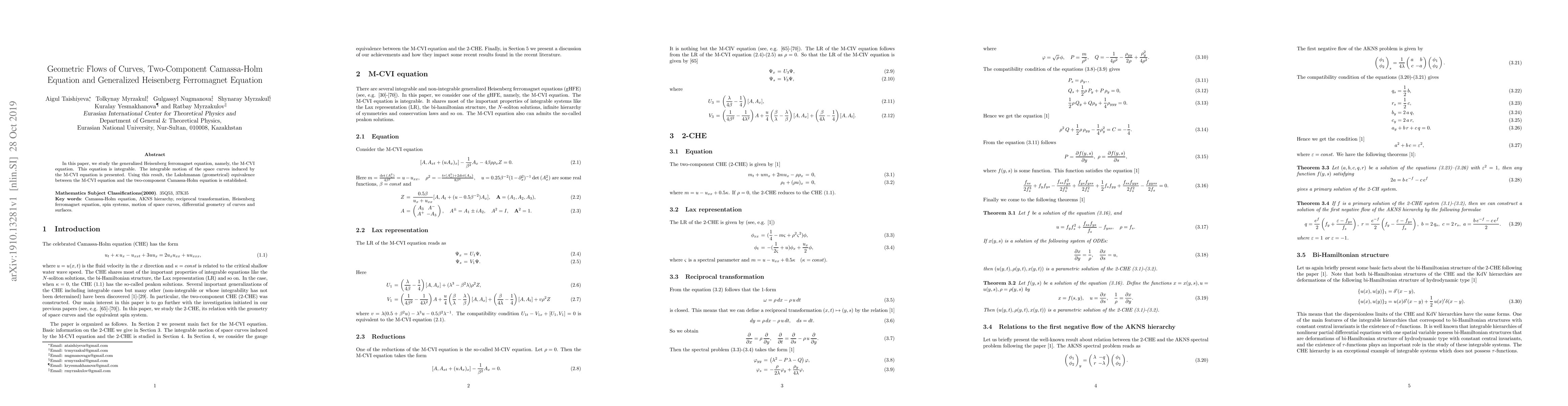 This paper explores the integrable M-CVI equation, demonstrating its geometric flow on space curves, and establishes its equivalence to the two-component Camassa-Holm equation through Lakshmanan's geometrical framework.