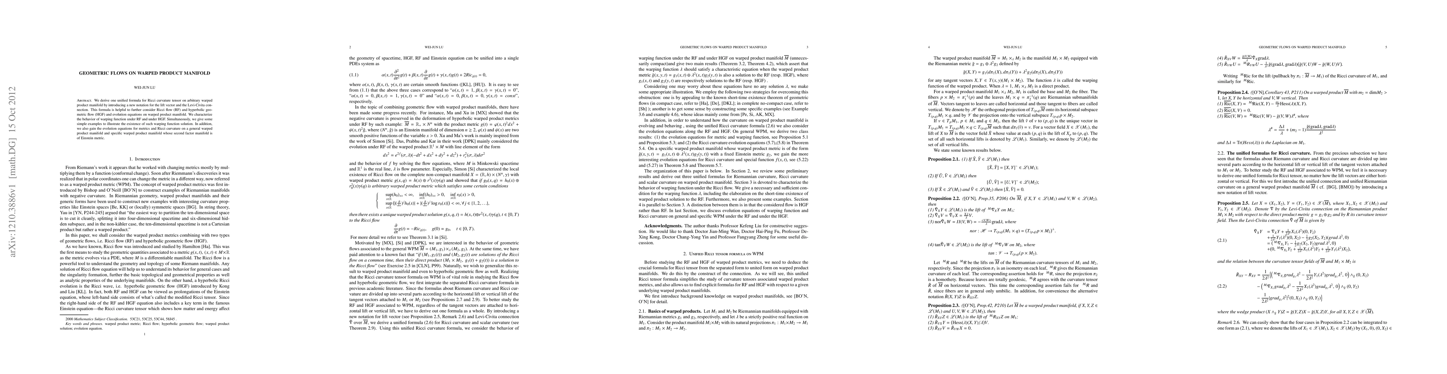 This paper derives a unified formula for the Ricci curvature tensor on warped product manifolds, introducing new notations for the lift vector and Levi-Civita connection. It characterizes the behavior of the warping function under Ricci flow and hyperbolic geometric flow, and provides evolution equations for metrics and Ricci curvature on both general and specific warped product manifolds.