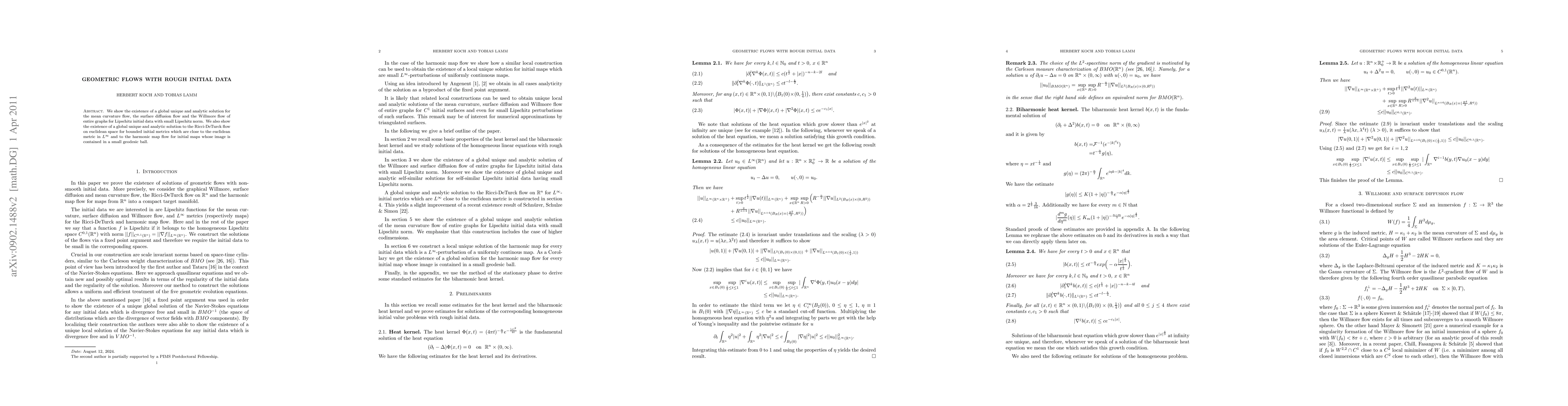 This research demonstrates the existence of unique and analytic solutions for various geometric flows (mean curvature, surface diffusion, Willmore) with rough initial data, specifically Lipschitz with small norm. It also proves solutions for Ricci-DeTurck flow with initial metrics near Euclidean, and harmonic map flow with image in a small geodesic ball.