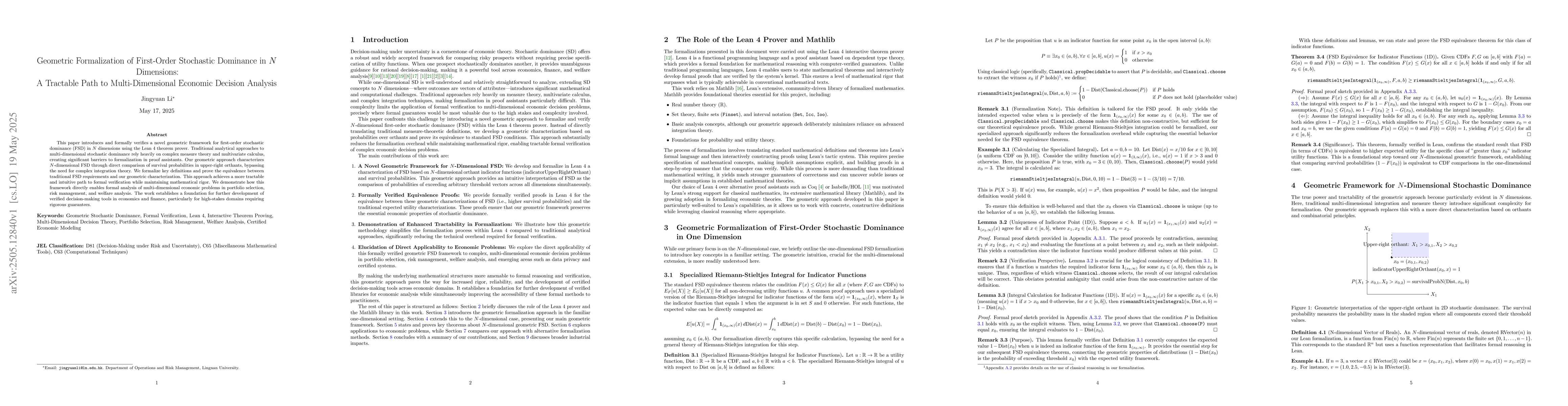 The paper introduces a geometric framework for first-order stochastic dominance (FSD) in N dimensions, utilizing the Lean 4 theorem prover to formally verify this approach, bypassing the need for complex measure theory and multivariate calculus.