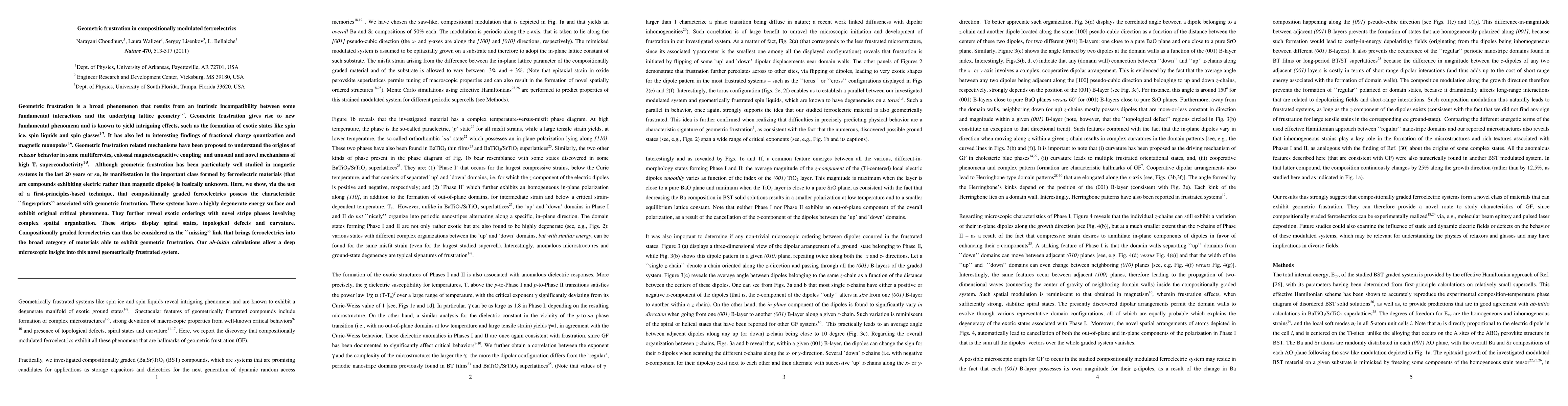 This paper demonstrates that compositionally modulated ferroelectrics exhibit geometric frustration, characterized by a highly degenerate energy landscape and exotic orderings. Using first-principles calculations, the study reveals novel critical phenomena and complex spatial organization in the form of spiral states and topological defects, positioning these materials as a new class capable of geometric frustration.