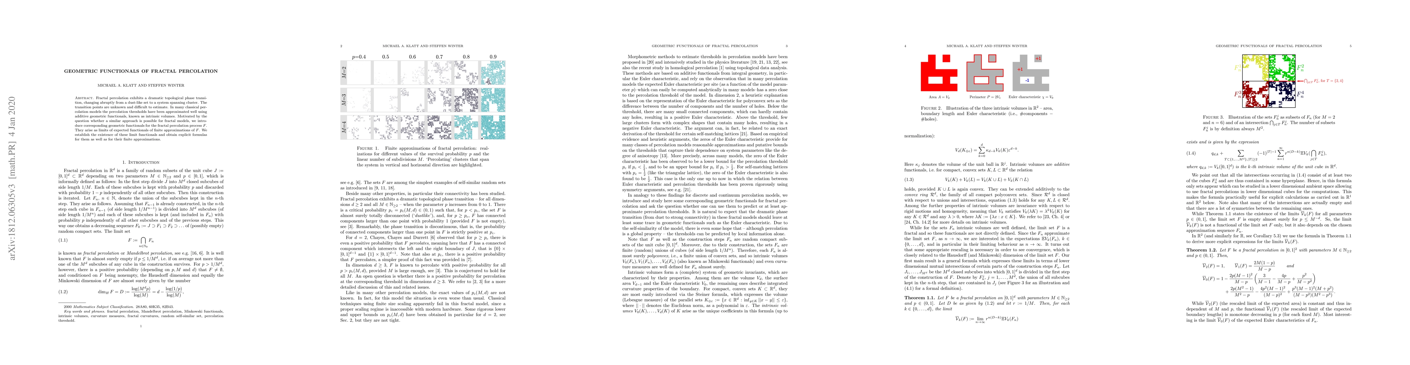 This paper introduces geometric functionals for fractal percolation, analogous to intrinsic volumes in classical percolation, to better understand the topological phase transition. The authors establish the existence of these limit functionals and provide explicit formulas for both the limits and their finite approximations.