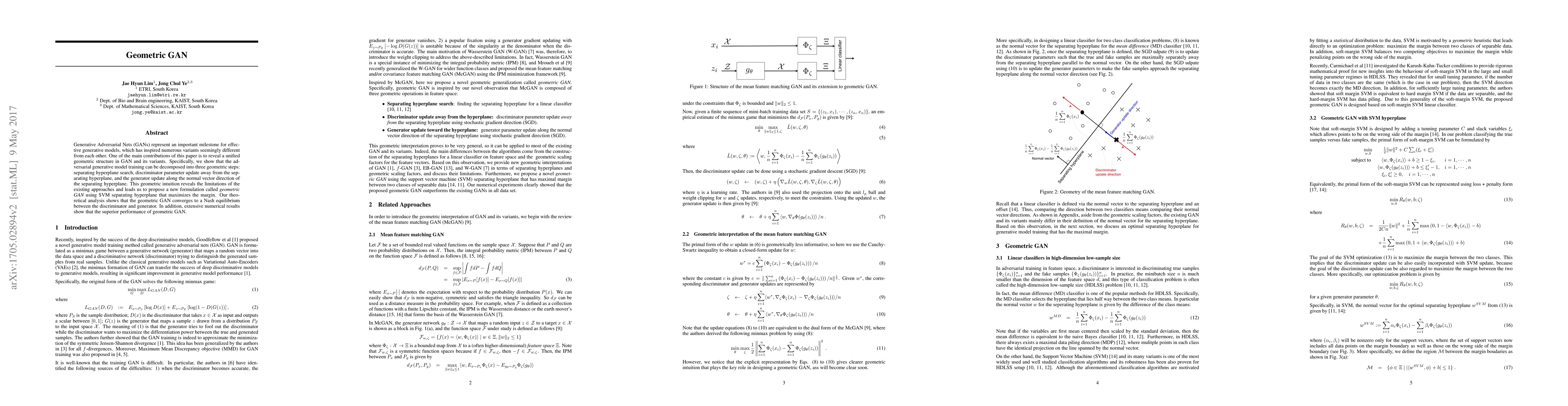 This paper unifies various GAN variants into a geometric structure, decomposing GAN training into three geometric steps. It proposes a new 'geometric GAN' formulation using SVM separating hyperplane for margin maximization, theoretically proven to converge to a Nash equilibrium. Experiments demonstrate its superior performance.
