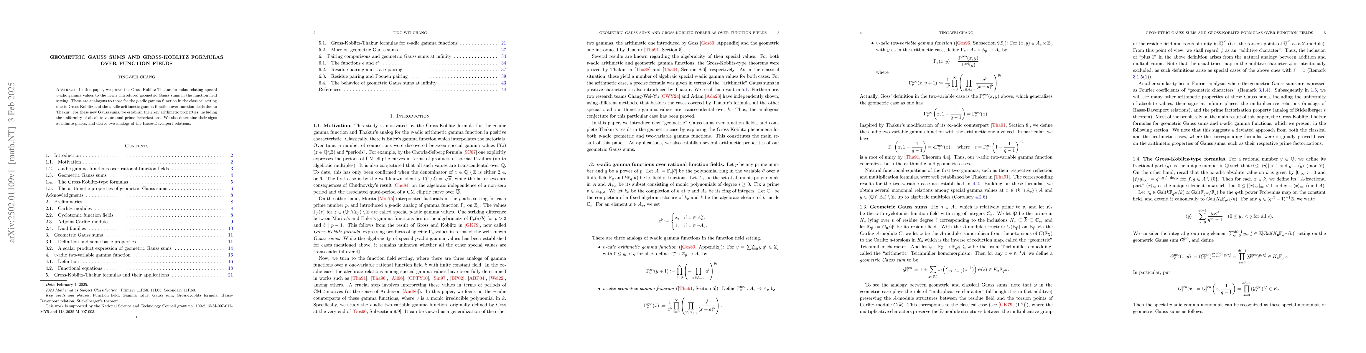 The paper introduces and rigorously analyzes geometric Gauss sums over function fields, proving their key arithmetic properties and establishing analogous formulas to the Gross-Koblitz-Thakur formulas in the classical setting.