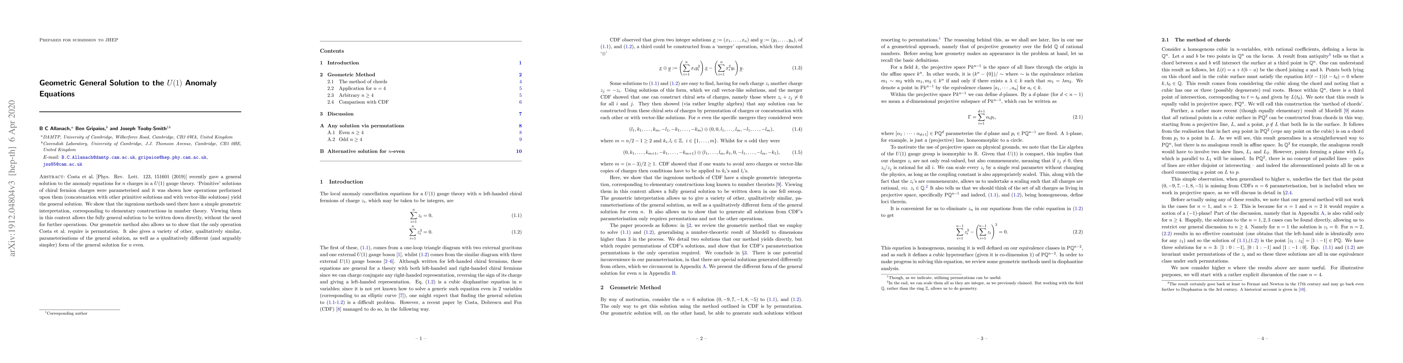 Costa et al. [Phys. Rev. Lett. 123, 151601 (2019)] recently gave a general solution to the anomaly equations for $n$ charges in a $U(1)$ gauge theory. `Primitive' solutions of chiral fermion charges were parameterised and it was shown how operations performed upon them (concatenation with other primitive solutions and with vector-like solutions) yield the general solution. We show that the ingenious methods used there have a simple geometric interpretation, corresponding to elementary constructions in number theory. Viewing them in this context allows the fully general solution to be written down directly, without the need for further operations. Our geometric method also allows us to show that the only operation Costa et al. require is permutation. It also gives a variety of other, qualitatively similar, parameterisations of the general solution, as well as a qualitatively different (and arguably simpler) form of the general solution for $n$ even.
