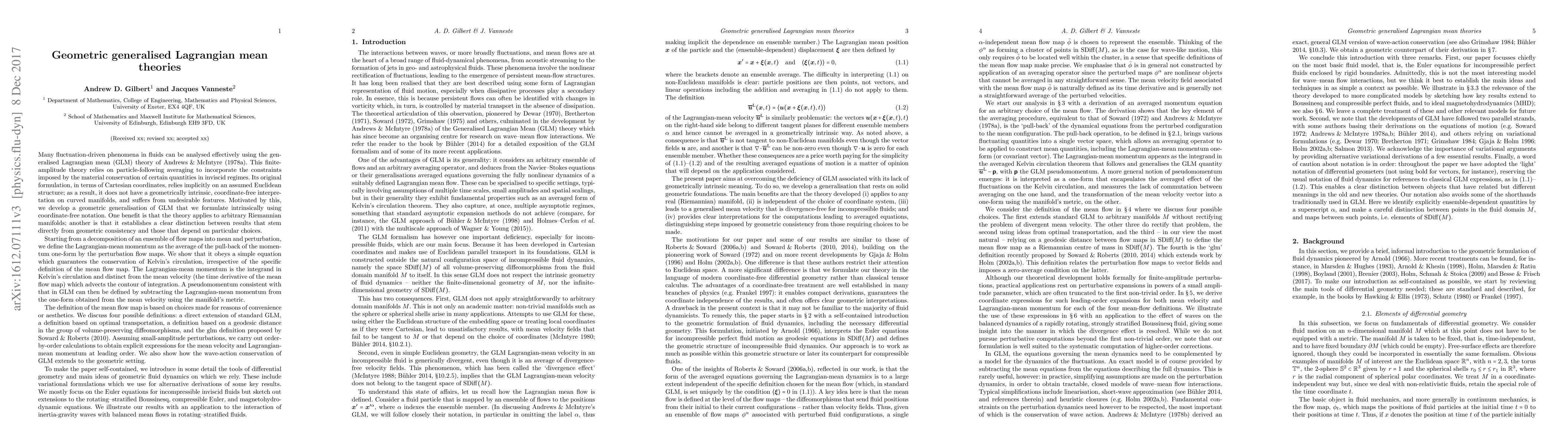 Many fluctuation-driven phenomena in fluids can be analysed effectively using the generalised Lagrangian mean (GLM) theory of Andrews & McIntyre (1978). This theory relies on particle-following averaging to incorporate the constraints imposed by the material conservations. It relies implicitly on an Euclidean structure; as a result, it does not have a geometrically intrinsic interpretation and suffers from undesirable features, including the divergence of the Lagrangian-mean velocity for incompressible fluids. Motivated by this, we develop a geometric generalisation of GLM that we formulate intrinsically. The theory applies to arbitrary Riemannian manifolds; it also establishes a clear distinction between results that stem directly from geometric consistency and those that depend on particular choices. We show that the Lagrangian mean momentum -- the average of the pull-back of the momentum one-form -- obeys a simple equation which guarantees the conservation of Kelvin's circulation, irrespective of the mean-flow definition. We discuss four possible definitions of the mean flow: a direct extension of standard GLM, a definition based on optimal transportation, a definition based on a geodesic distance in the group of volume-preserving diffeomorphisms, and the glm definition proposed by Soward & Roberts (2010). Assuming small-amplitude perturbations, we carry out order-by-order calculations to obtain explicit expressions for the mean flow and pseudomomentum at leading order. We also show how the wave-action conservation of GLM extends to the geometric setting. To make the paper self-contained, we introduce the tools of differential geometry and main ideas of geometric fluid dynamics on which we rely. We mostly focus on the Euler equations for incompressible inviscid fluids but sketch out extensions to the rotating-stratified Boussinesq, compressible Euler and magnetohydrodynamic equations.