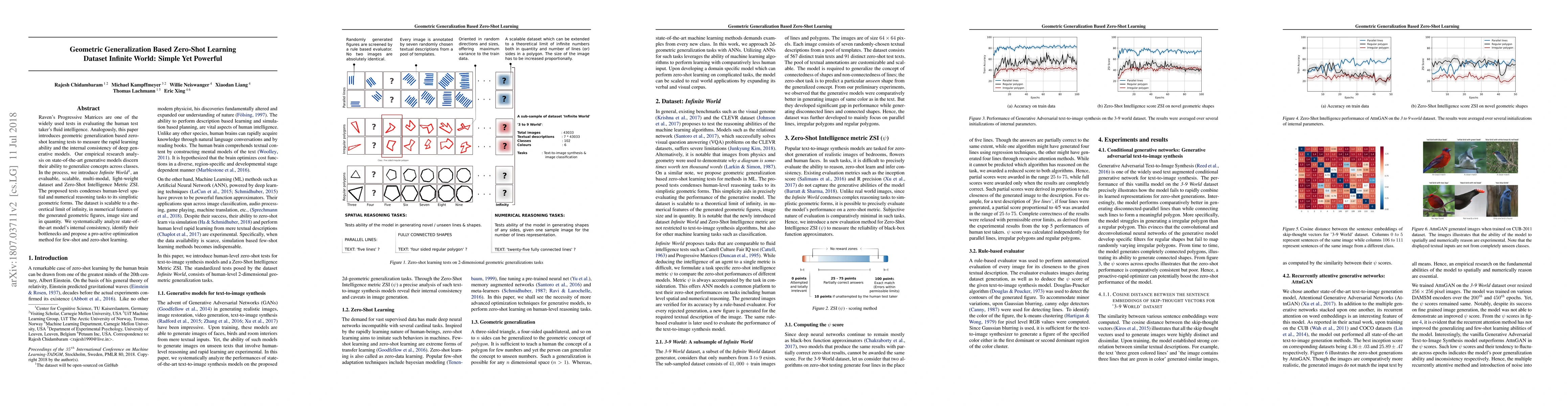 Raven's Progressive Matrices are one of the widely used tests in evaluating the human test taker's fluid intelligence. Analogously, this paper introduces geometric generalization based zero-shot learning tests to measure the rapid learning ability and the internal consistency of deep generative models. Our empirical research analysis on state-of-the-art generative models discern their ability to generalize concepts across classes. In the process, we introduce Infinite World, an evaluable, scalable, multi-modal, light-weight dataset and Zero-Shot Intelligence Metric ZSI. The proposed tests condenses human-level spatial and numerical reasoning tasks to its simplistic geometric forms. The dataset is scalable to a theoretical limit of infinity, in numerical features of the generated geometric figures, image size and in quantity. We systematically analyze state-of-the-art model's internal consistency, identify their bottlenecks and propose a pro-active optimization method for few-shot and zero-shot learning.