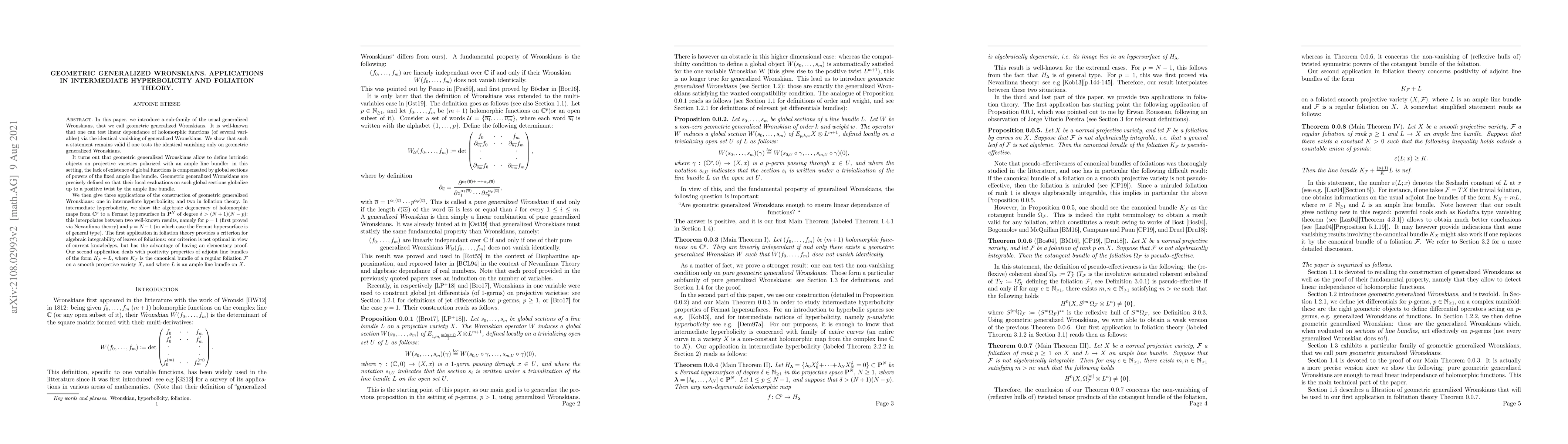 This paper introduces geometric generalized Wronskians, a sub-family of generalized Wronskians, to test linear dependence of holomorphic functions. It applies these constructs to demonstrate algebraic degeneracy in intermediate hyperbolicity and provides criteria for algebraic integrability and positivity properties in foliation theory.