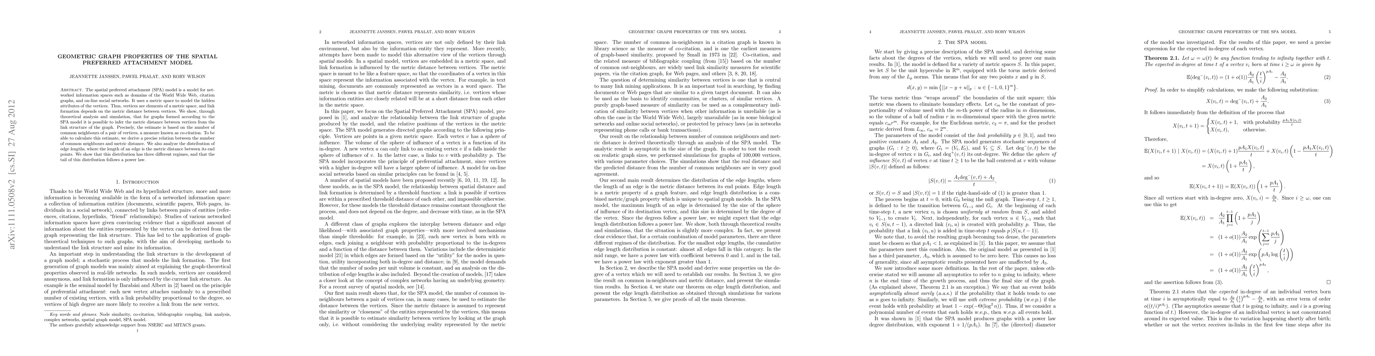 The spatial preferred attachment (SPA) model is a model for networked information spaces such as domains of the World Wide Web, citation graphs, and on-line social networks. It uses a metric space to model the hidden attributes of the vertices. Thus, vertices are elements of a metric space, and link formation depends on the metric distance between vertices. We show, through theoretical analysis and simulation, that for graphs formed according to the SPA model it is possible to infer the metric distance between vertices from the link structure of the graph. Precisely, the estimate is based on the number of common neighbours of a pair of vertices, a measure known as {\sl co-citation}. To be able to calculate this estimate, we derive a precise relation between the number of common neighbours and metric distance. We also analyze the distribution of {\sl edge lengths}, where the length of an edge is the metric distance between its end points. We show that this distribution has three different regimes, and that the tail of this distribution follows a power law.