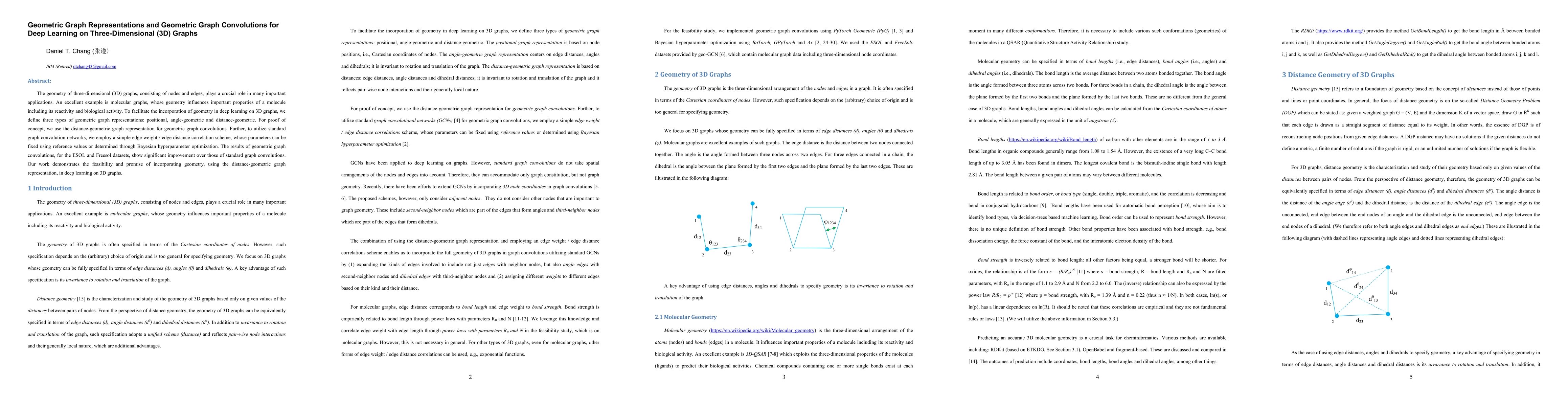 This paper introduces geometric graph representations—positional, angle-geometric, and distance-geometric—to incorporate geometry in deep learning on 3D graphs, exemplified by molecular graphs. The distance-geometric representation, along with a novel edge weight scheme, significantly improves performance on ESOL and Freesol datasets compared to standard graph convolutions.