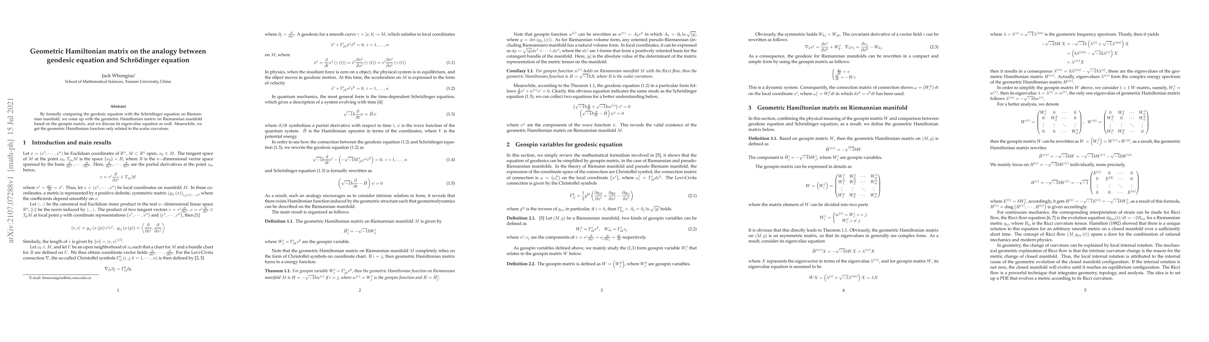 This paper proposes a geometric Hamiltonian matrix for Riemannian manifolds, drawing an analogy between the geodesic equation and the Schrödinger equation. It introduces the concept of a geospin matrix and derives an eigenvalue equation. The research also uncovers a Hamiltonian function dependent solely on the scalar curvature.