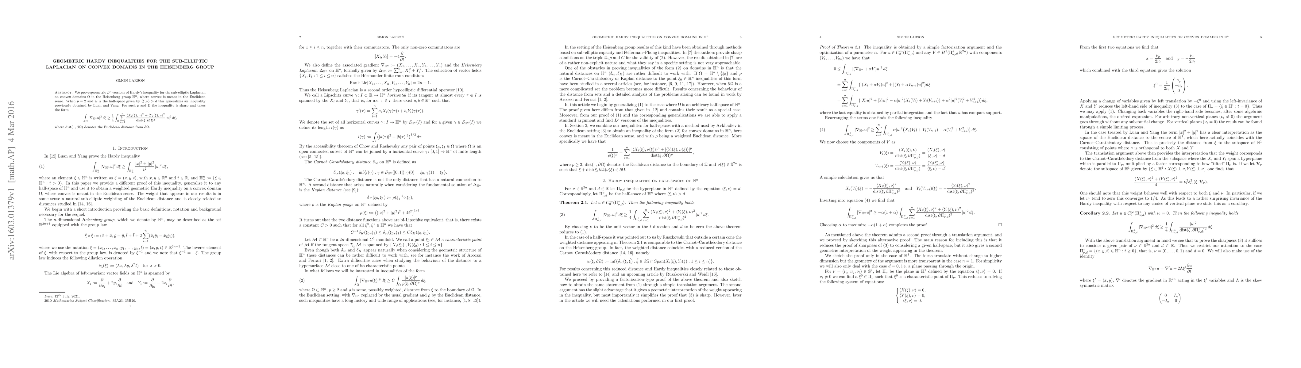 We prove geometric $L^p$ versions of Hardy's inequality for the sub-elliptic Laplacian on convex domains $\Omega$ in the Heisenberg group $\mathbb{H}^n$, where convex is meant in the Euclidean sense. When $p=2$ and $\Omega$ is the half-space given by $\langle \xi, \nu\rangle > d$ this generalizes an inequality previously obtained by Luan and Yang. For such $p$ and $\Omega$ the inequality is sharp and takes the form \begin{equation} \int_\Omega |\nabla_{\mathbb{H}^n}u|^2 \, d\xi \geq \frac{1}{4}\int_{\Omega} \sum_{i=1}^n\frac{\langle X_i(\xi), \nu\rangle^2+\langle Y_i(\xi), \nu\rangle^2}{\textrm{dist}(\xi, \partial \Omega)^2}|u|^2\, d\xi, \end{equation} where $\textrm{dist}(\, \cdot\,, \partial \Omega)$ denotes the Euclidean distance from $\partial \Omega$.