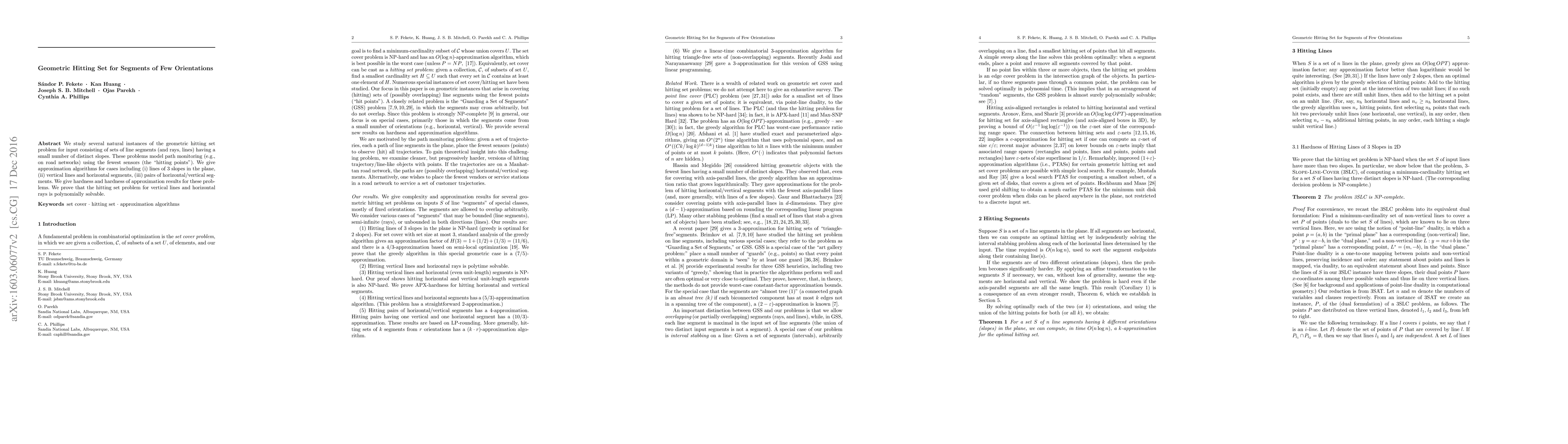 We study several natural instances of the geometric hitting set problem for input consisting of sets of line segments (and rays, lines) having a small number of distinct slopes. These problems model path monitoring (e.g., on road networks) using the fewest sensors (the "hitting points"). We give approximation algorithms for cases including (i) lines of 3 slopes in the plane, (ii) vertical lines and horizontal segments, (iii) pairs of horizontal/vertical segments. We give hardness and hardness of approximation results for these problems. We prove that the hitting set problem for vertical lines and horizontal rays is polynomially solvable.