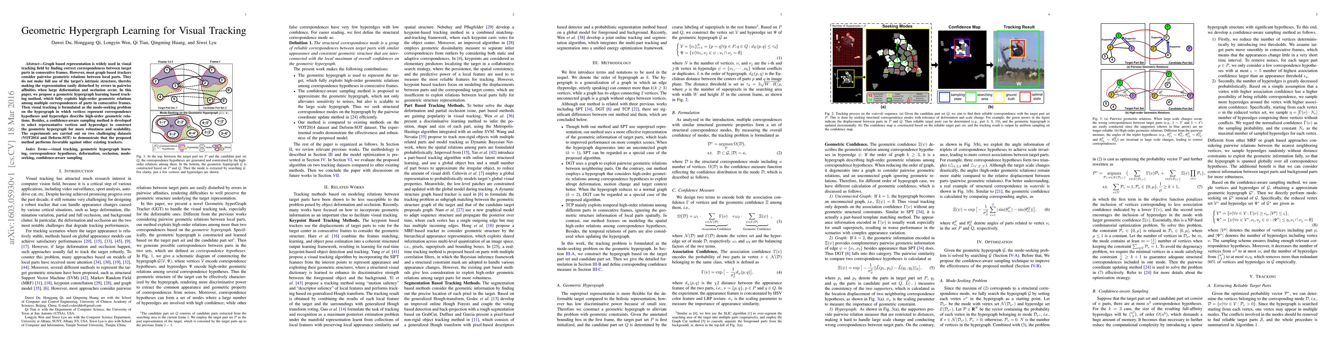 Graph based representation is widely used in visual tracking field by finding correct correspondences between target parts in consecutive frames. However, most graph based trackers consider pairwise geometric relations between local parts. They do not make full use of the target's intrinsic structure, thereby making the representation easily disturbed by errors in pairwise affinities when large deformation and occlusion occur. In this paper, we propose a geometric hypergraph learning based tracking method, which fully exploits high-order geometric relations among multiple correspondences of parts in consecutive frames. Then visual tracking is formulated as the mode-seeking problem on the hypergraph in which vertices represent correspondence hypotheses and hyperedges describe high-order geometric relations. Besides, a confidence-aware sampling method is developed to select representative vertices and hyperedges to construct the geometric hypergraph for more robustness and scalability. The experiments are carried out on two challenging datasets (VOT2014 and Deform-SOT) to demonstrate that the proposed method performs favorable against other existing trackers.