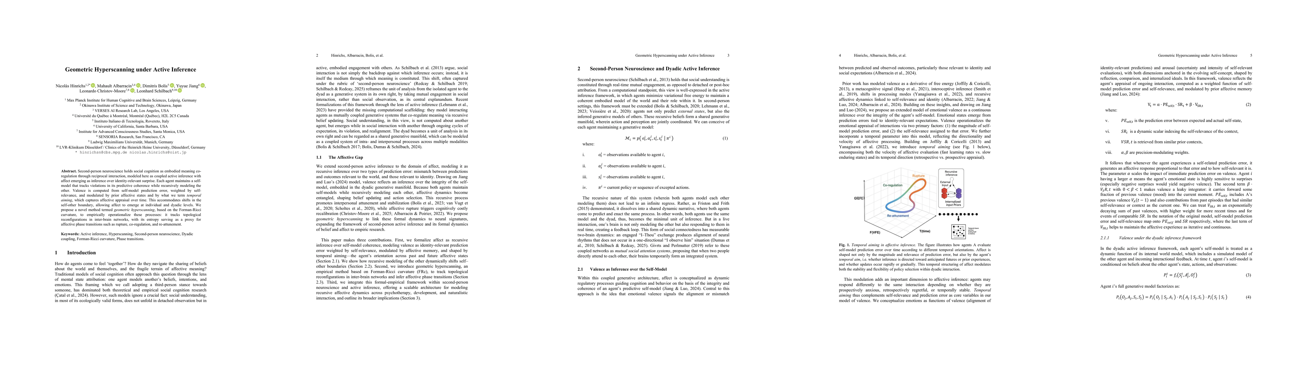 This research proposes 'geometric hyperscanning' to study social cognition, modeling it as coupled active inference where affect arises from surprise about one's identity. Utilizing Forman-Ricci curvature, it examines topological changes in inter-brain networks, linking these to affective shifts like rupture, co-regulation, and re-attunement.