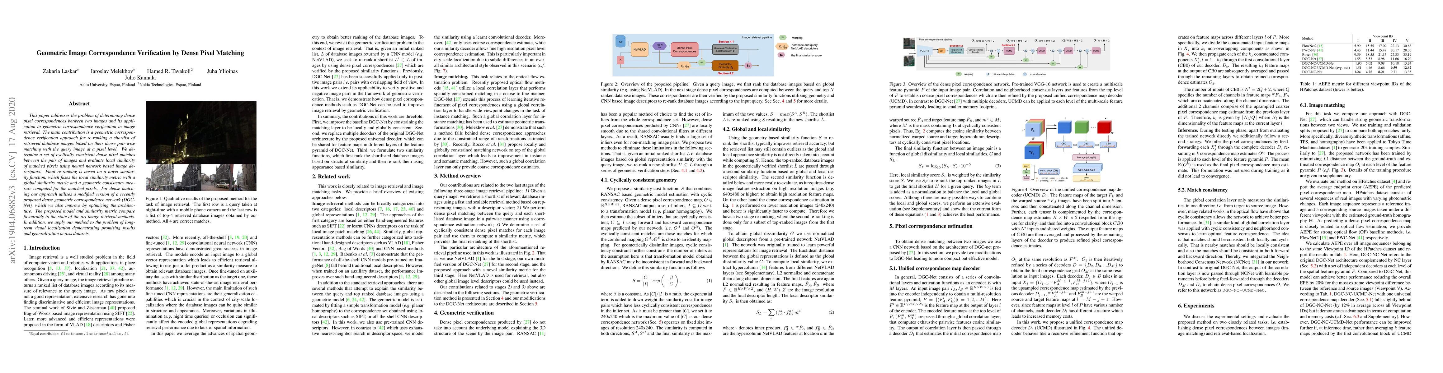 This paper proposes a method for verifying geometric correspondences between images through dense pixel matching, utilizing a modified DGC-Net and a novel similarity function that combines local and global metrics for re-ranking retrieved images, outperforming state-of-the-art methods in image retrieval. The approach also shows potential for long-term visual localization.