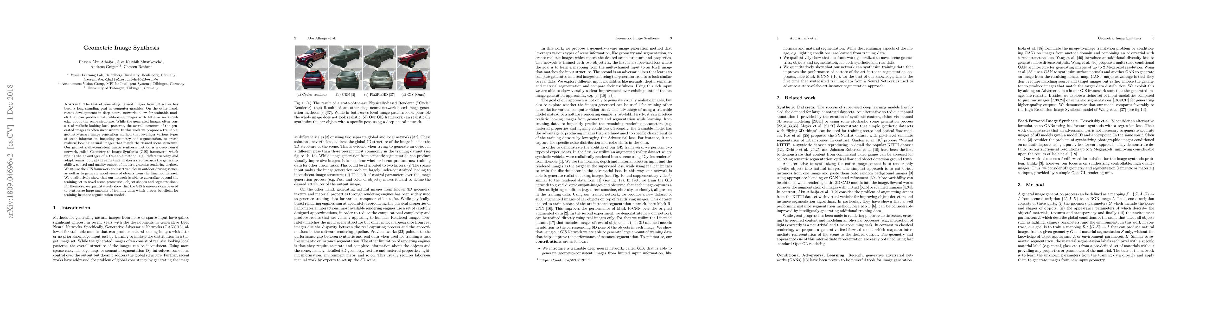 The task of generating natural images from 3D scenes has been a long standing goal in computer graphics. On the other hand, recent developments in deep neural networks allow for trainable models that can produce natural-looking images with little or no knowledge about the scene structure. While the generated images often consist of realistic looking local patterns, the overall structure of the generated images is often inconsistent. In this work we propose a trainable, geometry-aware image generation method that leverages various types of scene information, including geometry and segmentation, to create realistic looking natural images that match the desired scene structure. Our geometrically-consistent image synthesis method is a deep neural network, called Geometry to Image Synthesis (GIS) framework, which retains the advantages of a trainable method, e.g., differentiability and adaptiveness, but, at the same time, makes a step towards the generalizability, control and quality output of modern graphics rendering engines. We utilize the GIS framework to insert vehicles in outdoor driving scenes, as well as to generate novel views of objects from the Linemod dataset. We qualitatively show that our network is able to generalize beyond the training set to novel scene geometries, object shapes and segmentations. Furthermore, we quantitatively show that the GIS framework can be used to synthesize large amounts of training data which proves beneficial for training instance segmentation models.