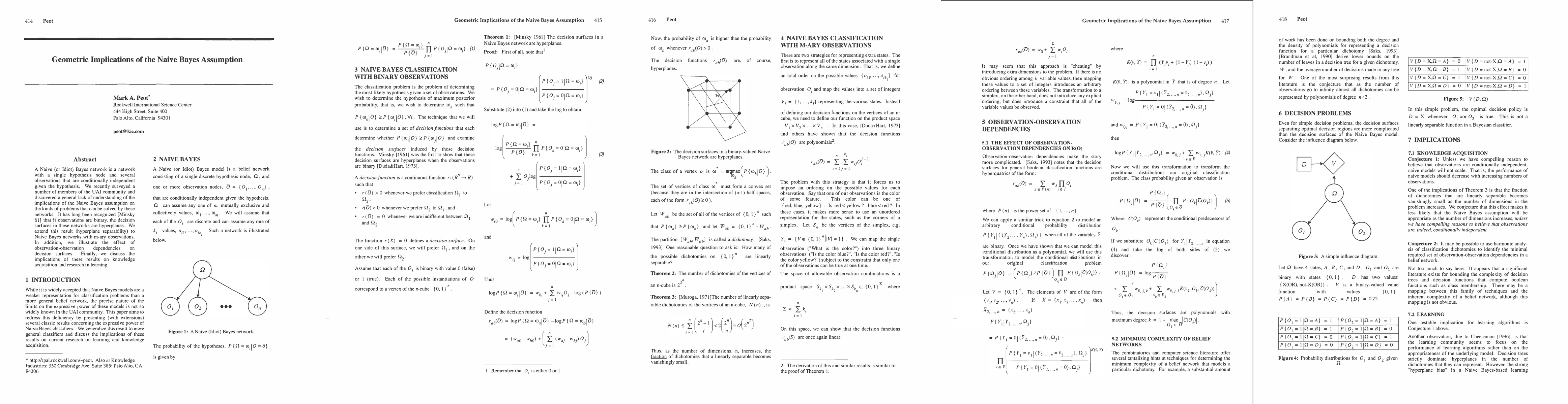 This paper explores the geometric implications of the Naive Bayes assumption, extending the known result that binary observations create hyperplane decision surfaces to networks with m-ary observations. It also examines the impact of observation-observation dependencies on these surfaces, discussing implications for knowledge acquisition and learning research.
