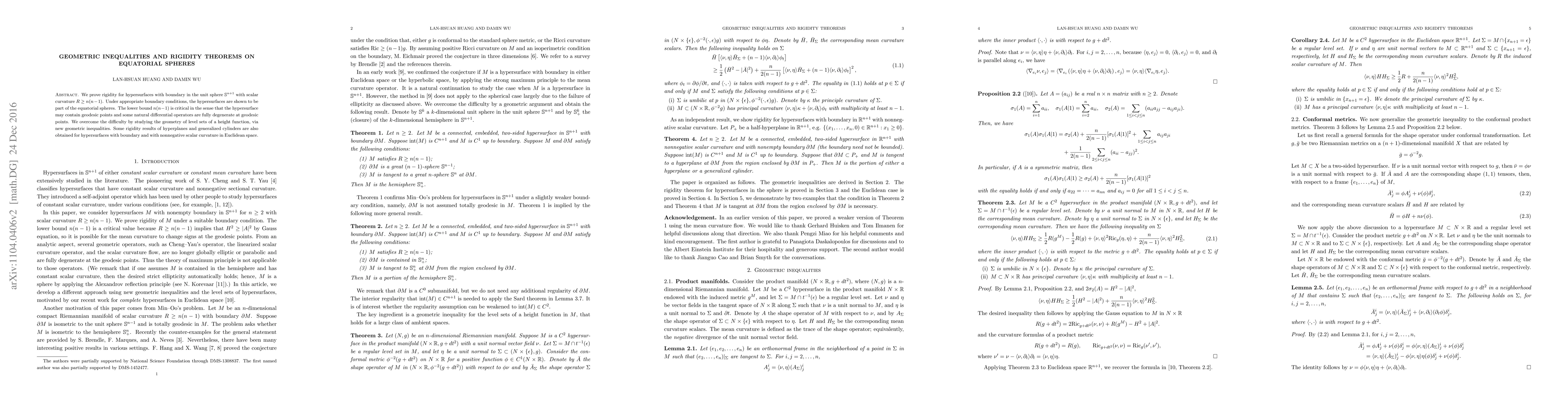 We prove rigidity for hypersurfaces with boundary in the unit $(n+1)$-sphere with scalar curvature bounded below by $n(n-1)$. Under appropriate boundary conditions, the hypersurfaces are shown to be part of the equatorial spheres. The lower bound $n(n-1)$ is critical in the sense that the hypersurface may contain geodesic points and some natural differential operators are fully degenerate at geodesic points. We overcome the difficulty by studying the geometry of level sets of a height function, via new geometric inequalities. Some rigidity results of hyperplanes and generalized cylinders are also obtained for hypersurfaces with boundary and with nonnegative scalar curvature in Euclidean space.