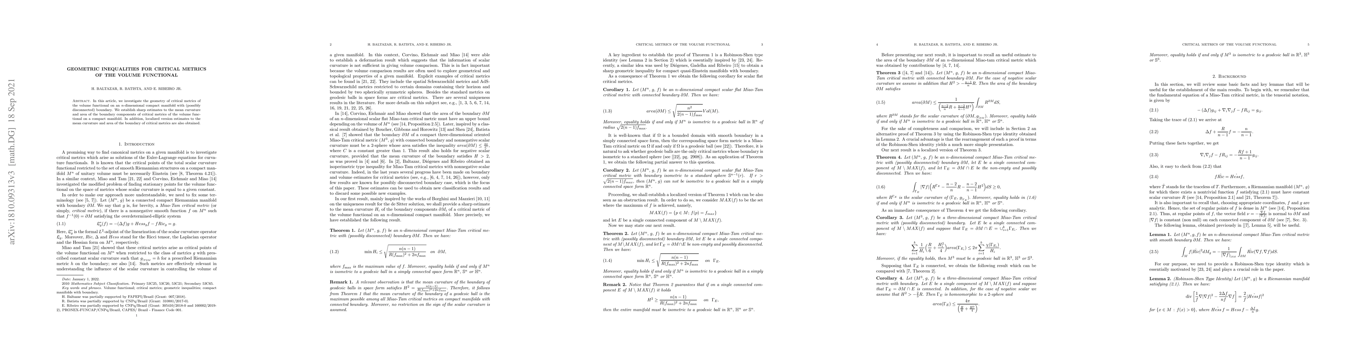 This paper investigates geometric properties of critical metrics for the volume functional on compact $n$-dimensional manifolds with boundary, establishing sharp estimates for the mean curvature and area of boundary components. It also provides localized estimates for the mean curvature and boundary area of these critical metrics.