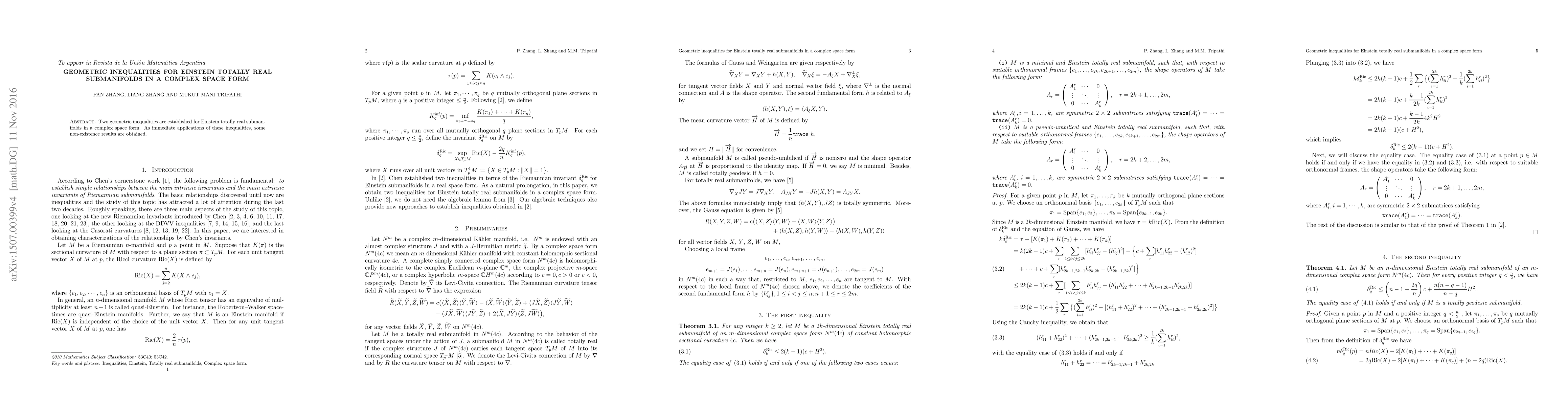 Summary: This paper establishes two geometric inequalities for Einstein totally real submanifolds within a complex space form, leading to the derivation of non-existence results for certain configurations.
