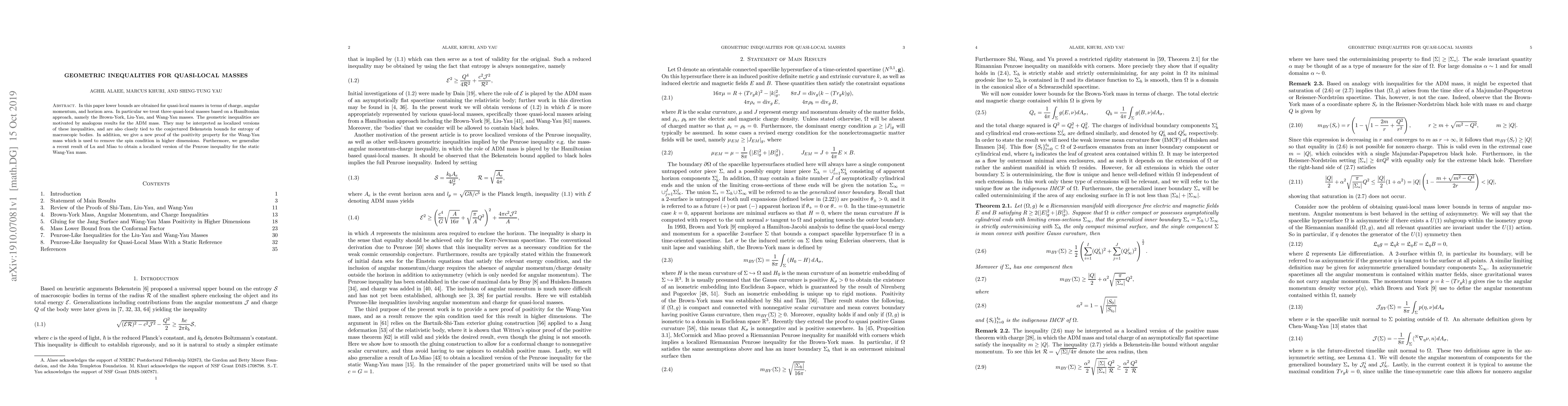 In this paper lower bounds are obtained for quasi-local masses in terms of charge, angular momentum, and horizon area. In particular we treat three quasi-local masses based on a Hamiltonian approach, namely the Brown-York, Liu-Yau, and Wang-Yau masses. The geometric inequalities are motivated by analogous results for the ADM mass. They may be interpreted as localized versions of these inequalities, and are also closely tied to the conjectured Bekenstein bounds for entropy of macroscopic bodies. In addition, we give a new proof of the positivity property for the Wang-Yau mass which is used to remove the spin condition in higher dimensions. Furthermore, we generalize a recent result of Lu and Miao to obtain a localized version of the Penrose inequality for the static Wang-Yau mass.