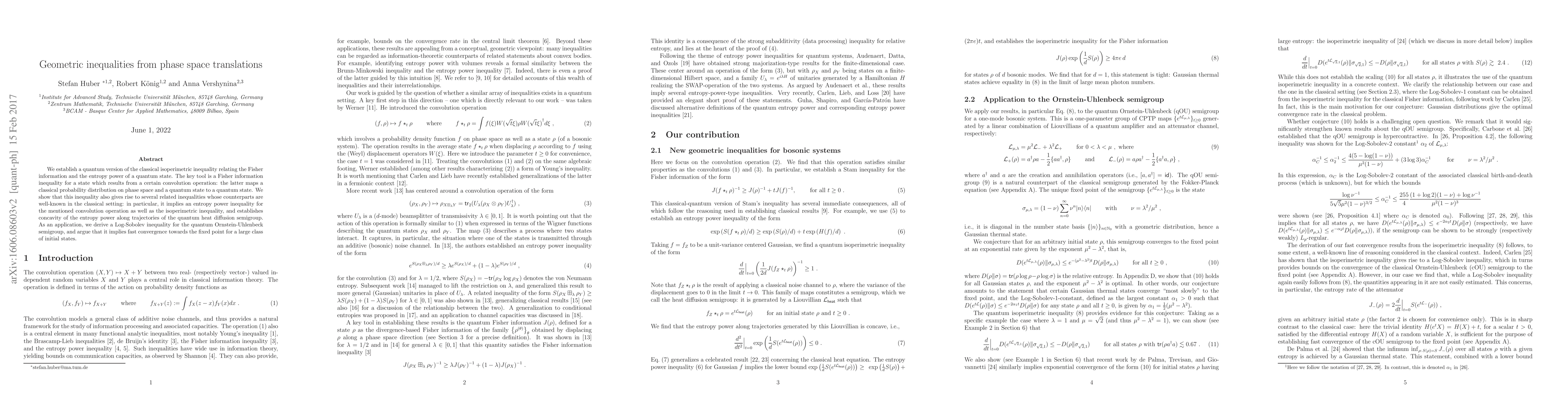 We establish a quantum version of the classical isoperimetric inequality relating the Fisher information and the entropy power of a quantum state. The key tool is a Fisher information inequality for a state which results from a certain convolution operation: the latter maps a classical probability distribution on phase space and a quantum state to a quantum state. We show that this inequality also gives rise to several related inequalities whose counterparts are well-known in the classical setting: in particular, it implies an entropy power inequality for the mentioned convolution operation as well as the isoperimetric inequality, and establishes concavity of the entropy power along trajectories of the quantum heat diffusion semigroup. As an application, we derive a Log-Sobolev inequality for the quantum Ornstein-Uhlenbeck semigroup, and argue that it implies fast convergence towards the fixed point for a large class of initial states.