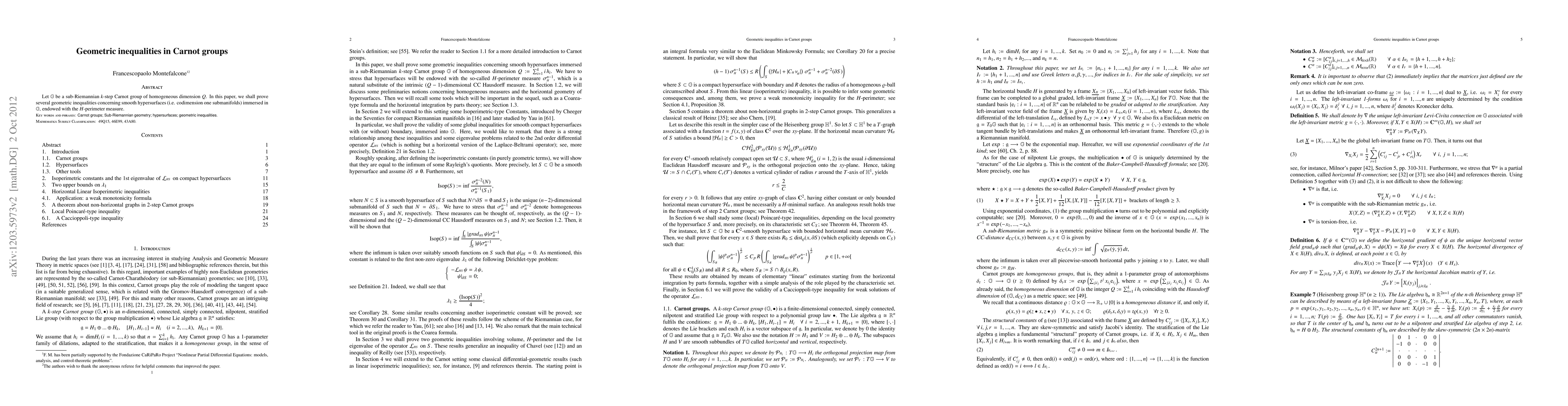 Let $\GG$ be a sub-Riemannian $k$-step Carnot group of homogeneous dimension $Q$. In this paper, we shall prove several geometric inequalities concerning smooth hypersurfaces (i.e. codimension one submanifolds) immersed in $\GG$, endowed with the $\HH$-perimeter measure.