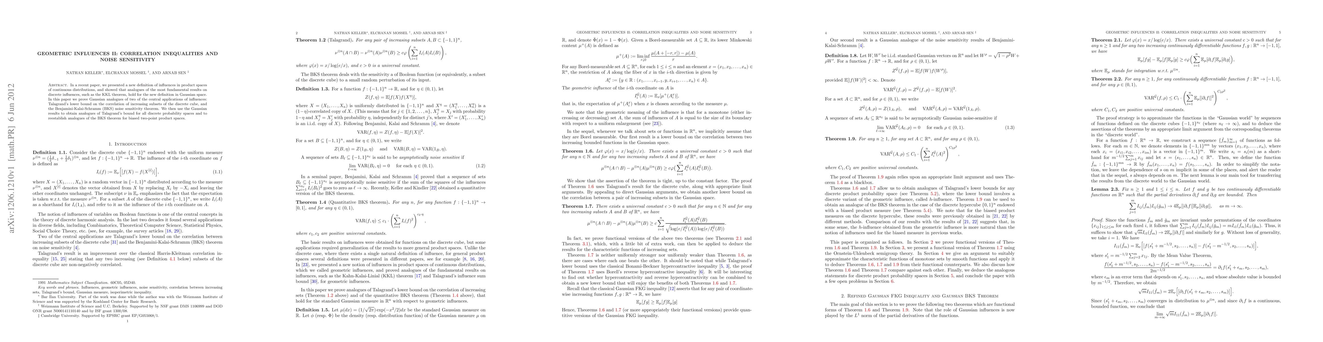 In a recent paper, we presented a new definition of influences in product spaces of continuous distributions, and showed that analogues of the most fundamental results on discrete influences, such as the KKL theorem, hold for the new definition in Gaussian space. In this paper we prove Gaussian analogues of two of the central applications of influences: Talagrand's lower bound on the correlation of increasing subsets of the discrete cube, and the Benjamini-Kalai-Schramm (BKS) noise sensitivity theorem. We then use the Gaussian results to obtain analogues of Talagrand's bound for all discrete probability spaces and to reestablish analogues of the BKS theorem for biased two-point product spaces.
