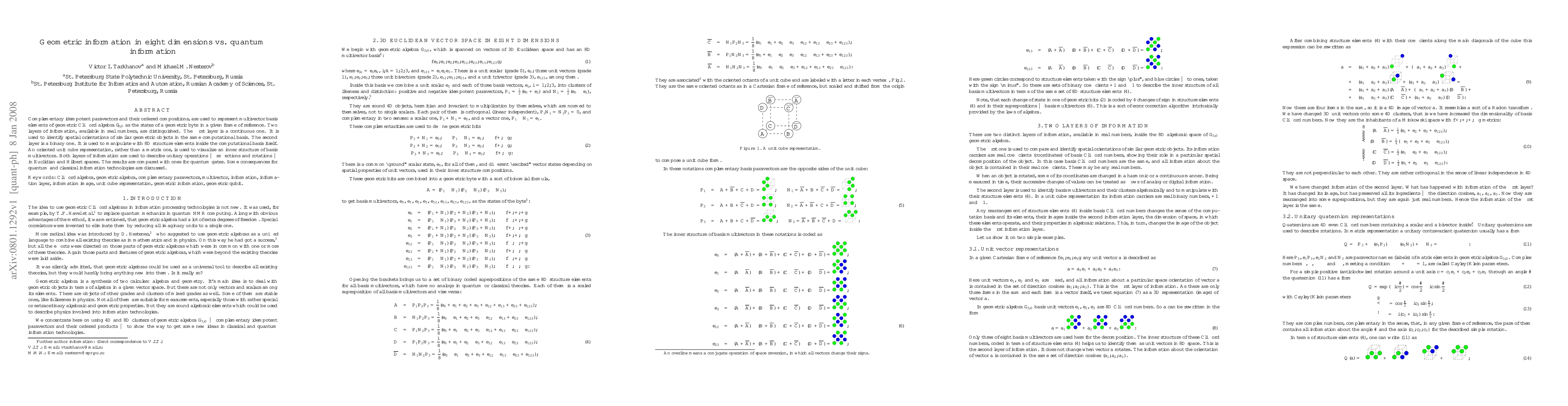 Complementary idempotent paravectors and their ordered compositions, are used to represent multivector basis elements of geometric Clifford algebra for 3D Euclidean space as the states of a geometric byte in a given frame of reference. Two layers of information, available in real numbers, are distinguished. The first layer is a continuous one. It is used to identify spatial orientations of similar geometric objects in the same computational basis. The second layer is a binary one. It is used to manipulate with 8D structure elements inside the computational basis itself. An oriented unit cube representation, rather than a matrix one, is used to visualize an inner structure of basis multivectors. Both layers of information are used to describe unitary operations -- reflections and rotations -- in Euclidian and Hilbert spaces. The results are compared with ones for quantum gates. Some consequences for quantum and classical information technologies are discussed.