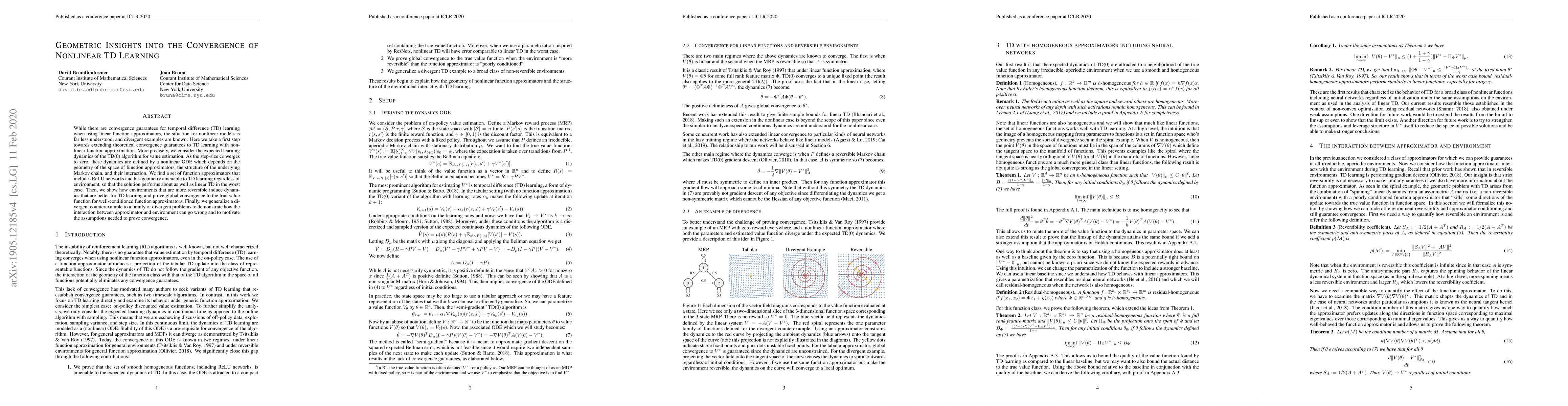 This paper investigates the convergence of nonlinear temporal difference (TD) learning, extending theoretical guarantees to nonlinear function approximators. It identifies a class of approximators, including ReLU networks, whose geometry supports TD learning, and proves global convergence under reversible environments.