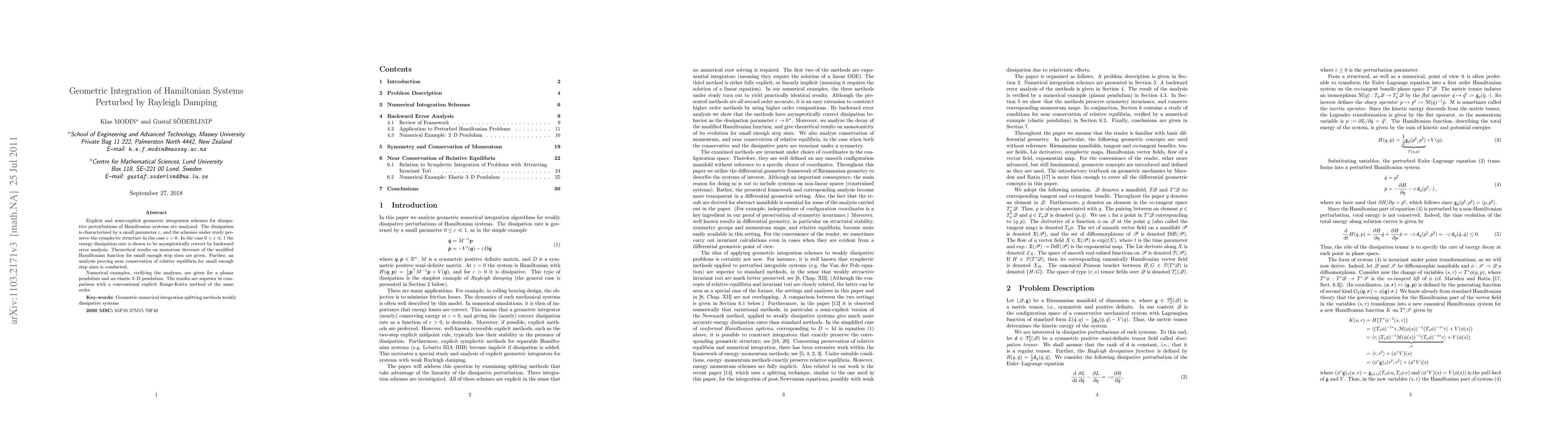 This paper analyzes geometric integration schemes for Hamiltonian systems with Rayleigh damping, proving their symplectic preservation and energy dissipation accuracy. Numerical examples show superior performance compared to conventional methods for systems like the planar and elastic 3-D pendulums.