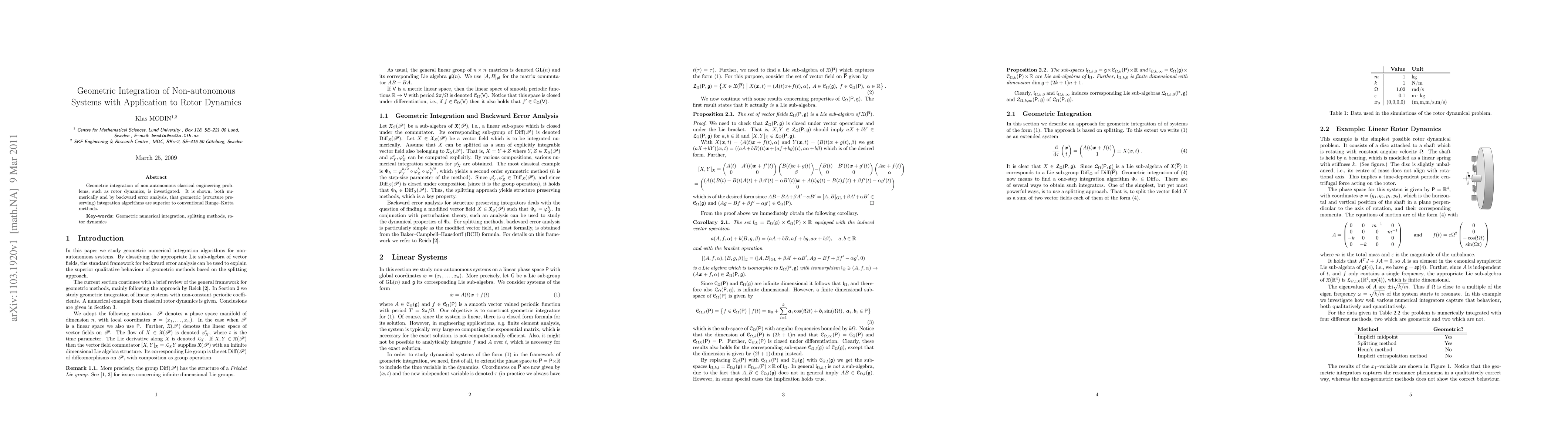Summary: This paper investigates geometric integration methods for non-autonomous systems, demonstrating their superiority through numerical simulations and backward error analysis. It applies these methods to rotor dynamics, showing improved performance compared to conventional Runge-Kutta methods.
